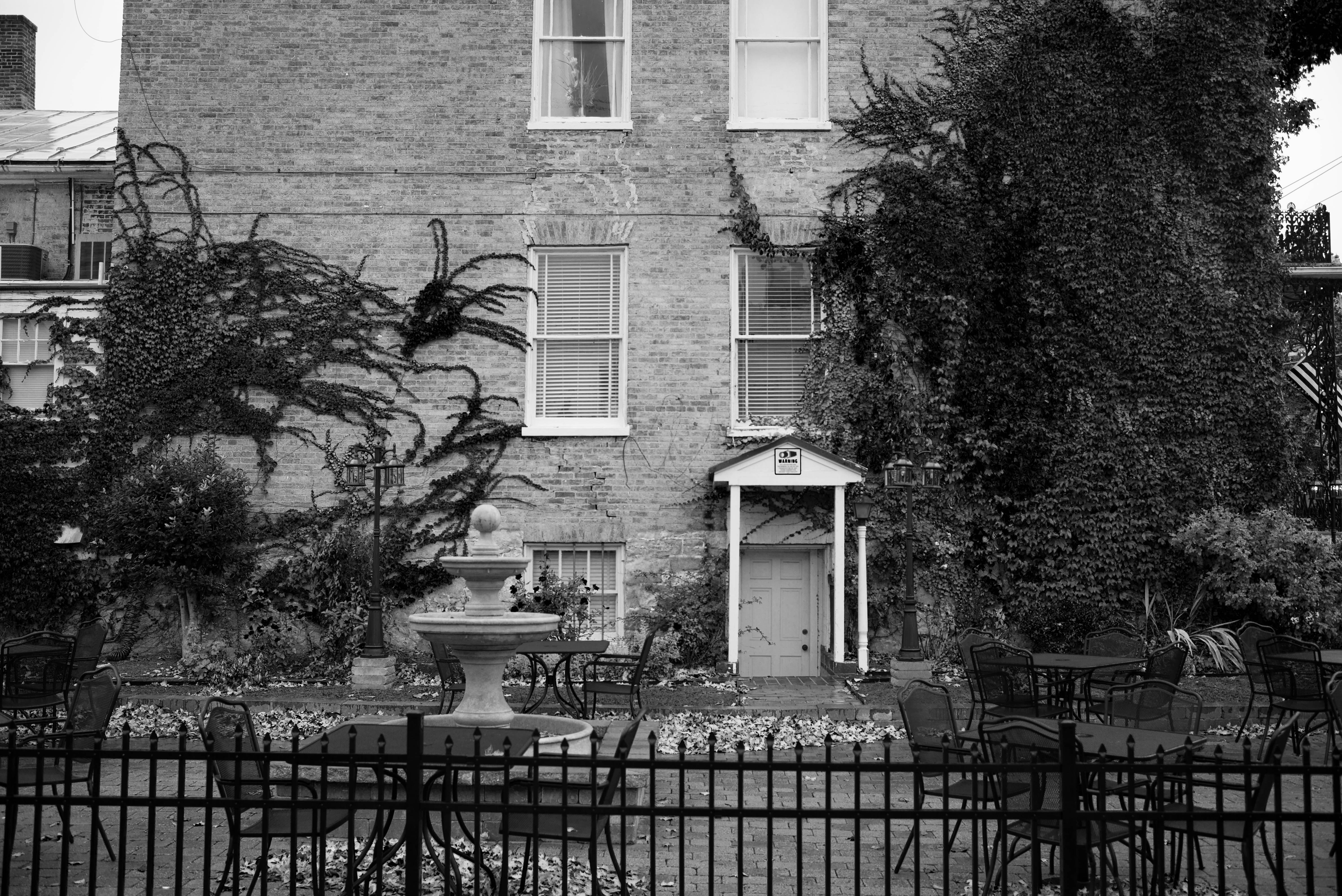 A charming courtyard unfolds before a historic brick building, its walls entwined with dark, leafy vines that echo years gone by. The subdued lighting casts a muted atmosphere, enhancing the tranquil mood, while scattered leaves hint at the passage of seasons. Black wrought iron tables invite quiet reflection, framed by the soft embrace of nature's reclamation.
