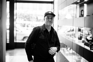 In this engaging black-and-white portrait, a man stands confidently amidst a minimalist display of cameras and accessories. The soft, ambient lighting highlights his relaxed demeanor, while the blurred background suggests a bustling urban environment. His casual attire and knowing smile convey a sense of approachability and passion for his craft.