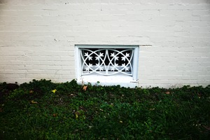 The photograph captures a muted white wall with an intricately designed window grate nestled near the ground, surrounded by lush green grass. The composition evokes a sense of tranquility, with the contrasting textures of the smooth wall and the vibrant foliage enhancing a mood of serene domesticity. Soft, natural light illuminates the scene, gently highlighting the delicate patterns of the grate and the subtle details of the surrounding grass.