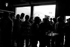 The photograph captures a bustling gathering in low light, with figures rendered as dark silhouettes against the bright backdrop of open doorways. The composition emphasizes the social atmosphere, as attendees engage in conversation, their details obscured, creating a sense of anonymity. The interplay of shadow and light evokes a mood of mystery and camaraderie in the setting.
