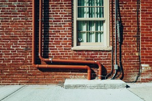 This photograph captures a striking composition of a brick wall adorned with industrial piping, leading the eye toward a modest window. The soft, natural light accentuates the warm hues of the brick and contrasts with the coolness of the green curtains, creating a mood of calm simplicity. The juxtaposition of urban elements and subtle architectural details lends an intriguing character to the scene.