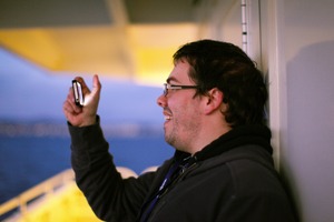 The photograph captures a man leaning against a wall on a boat, holding a phone with a soft smile on his face, suggesting a moment of connection or amusement. The warm yellow light contrasts with the cool tones of the ocean and sky in the background, creating a whimsical mood. His relaxed posture and expression evoke a sense of joy and serenity amidst the nautical setting.