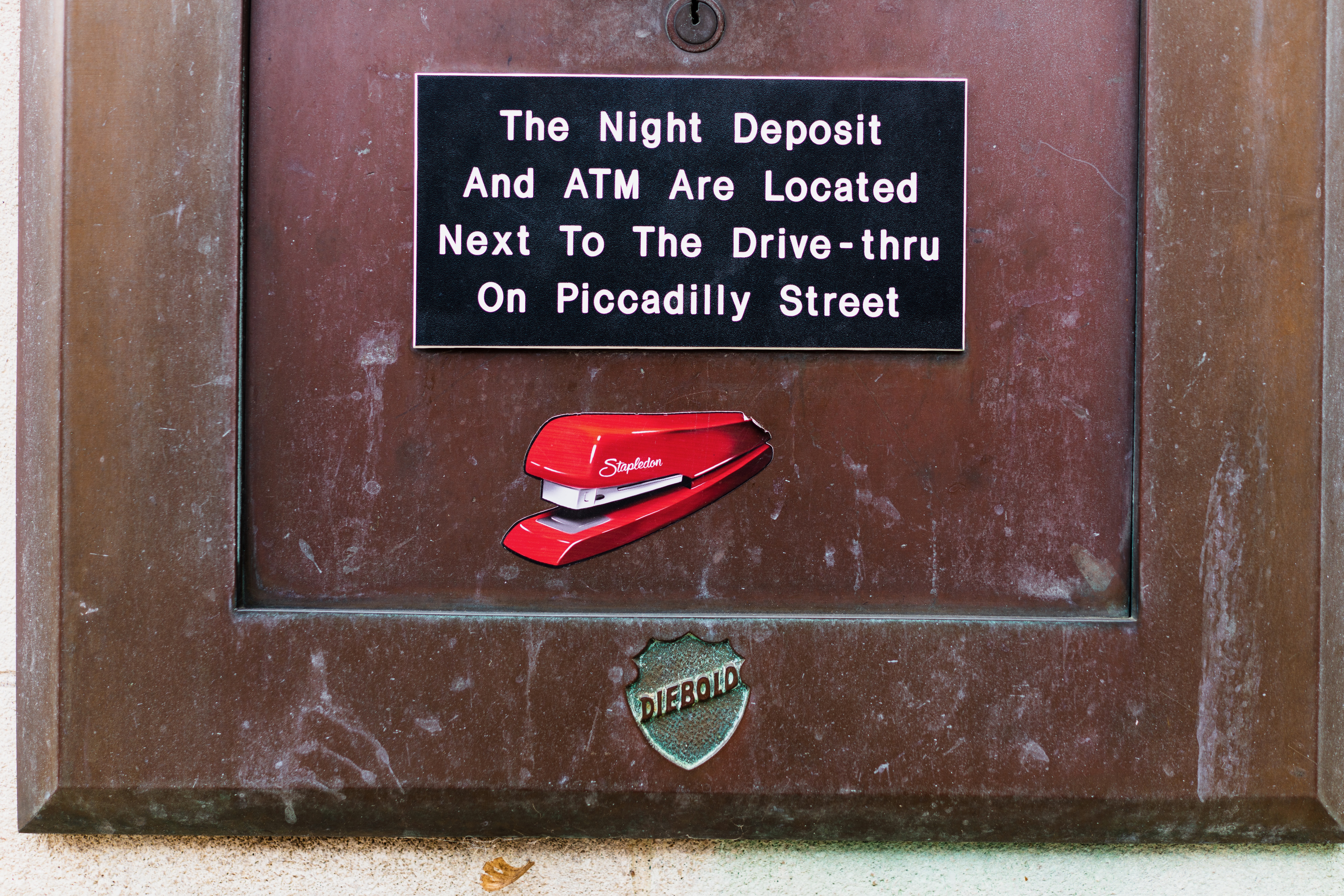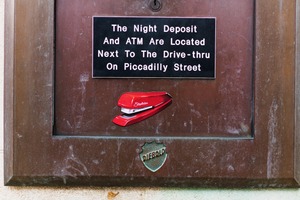A whimsical juxtaposition captures attention: a vibrant red stapler interrupts the mundane gray of a metal signage. The crisp black text directs passersby to essential services, but the bold pop of color and playful presence of the stapler evoke a sense of humor in an otherwise ordinary urban setting. Natural light highlights the textures of the metal, enhancing the photograph's intriguing charm.