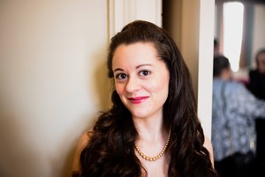 A young woman with long, wavy hair and classic makeup smiles softly against a neutral backdrop. The gentle lighting highlights her features and the pearl necklace adds a touch of elegance, creating a warm and inviting mood. In the blurred background, hints of a lively gathering suggest a celebratory atmosphere.