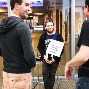 In a bustling conference setting, a relaxed young man holds a sign inviting attendees to ask for assistance. The lighting is bright and welcoming, highlighting his friendly expression amidst a backdrop of engaged conversations. This composition captures a sense of community and support, embodying the spirit of collaboration at the event.