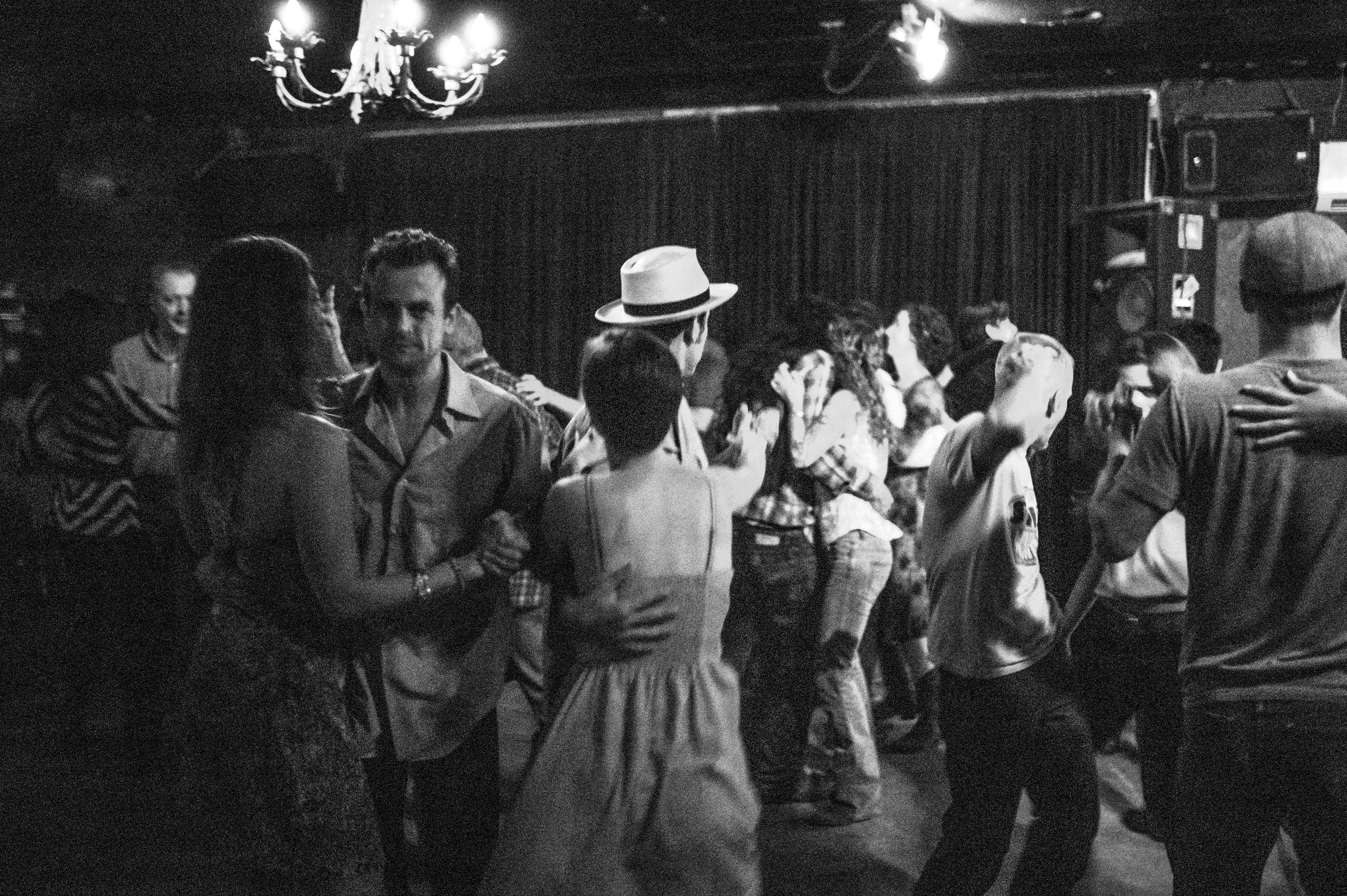 The photograph captures a lively scene in a dimly lit dance hall, where couples and friends move in rhythm, embodying joy and connection. The warm glow from the chandelier overhead casts a nostalgic aura, enhancing the intimate atmosphere of the gathering. With a blend of sharp contrast and motion blur, the composition invites viewers to feel the energy and camaraderie of the moment.