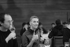 In a warmly lit dining setting, a man in the foreground gives a thumbs-up, exuding a cheerful demeanor. The blurred figures in the background suggest a social gathering, enriched by the soft glow from glasses and a rustic wooden backdrop, creating an inviting and relaxed atmosphere.