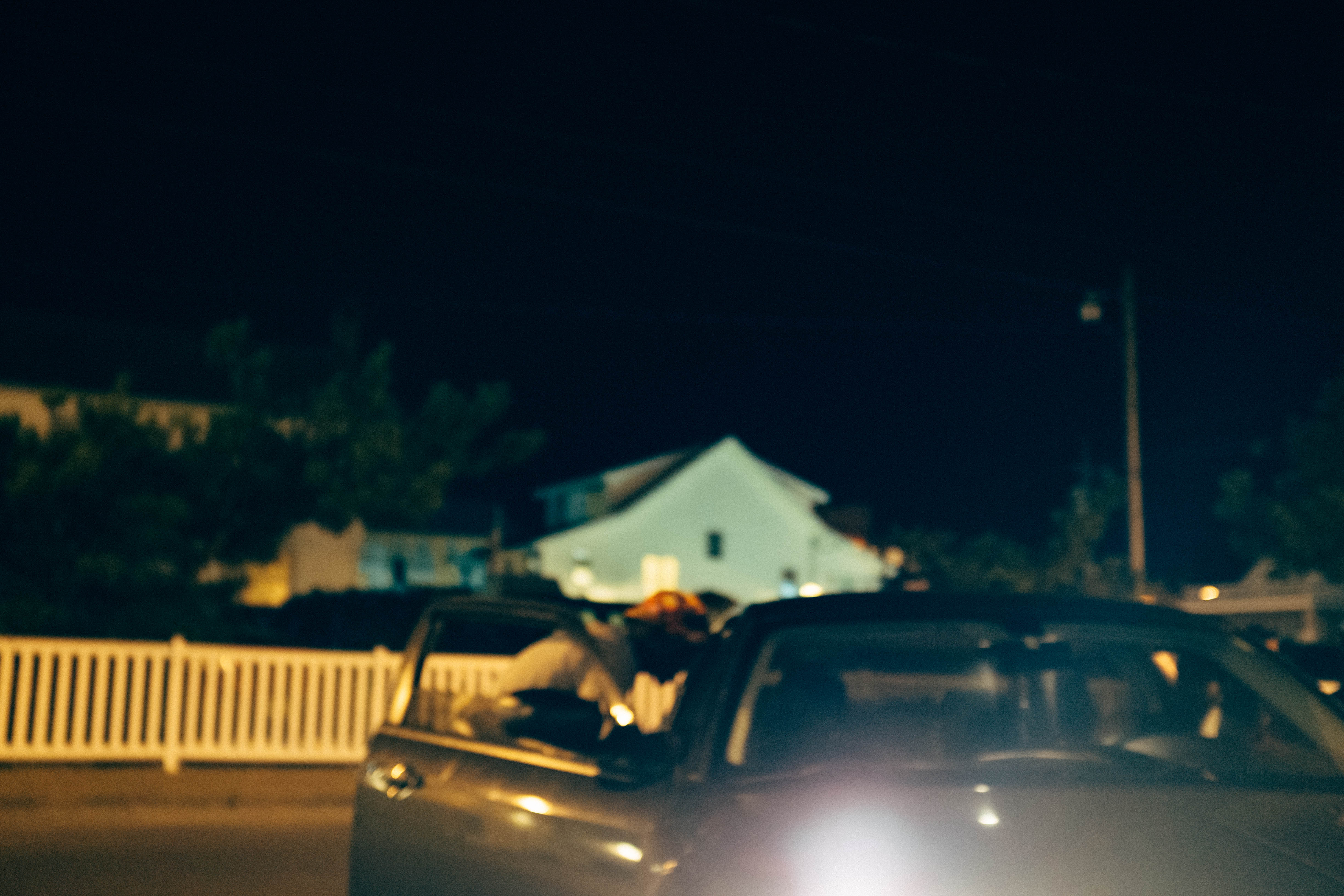 In this moody night scene, a figure leans out of a car, suggesting a moment of intimacy or discussion. The surrounding darkness, punctuated by the warm light of the vehicle, creates a sense of anonymity and intrigue. The blurred edges enhance the feeling of a fleeting moment, leaving the viewer curious about the interaction within.