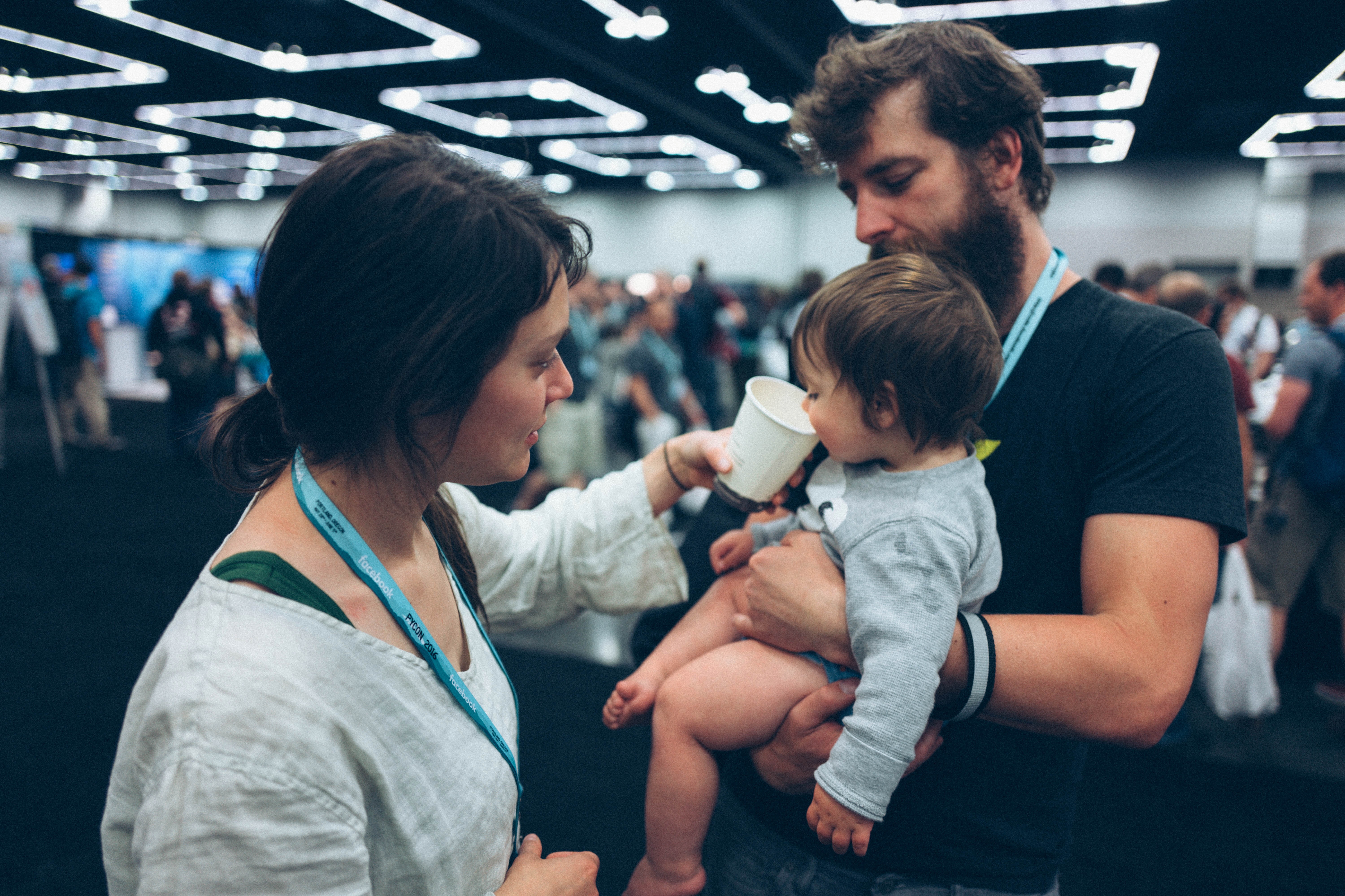 The photograph captures a tender family moment in a bustling conference setting, as a woman gently offers a drink to a curious toddler held by a man. Soft, diffused lighting highlights the connection between the three, creating a warm and inviting atmosphere amidst the crowded background. The expressions on their faces convey a sense of affection and engagement, contrasting beautifully with the busy event around them.