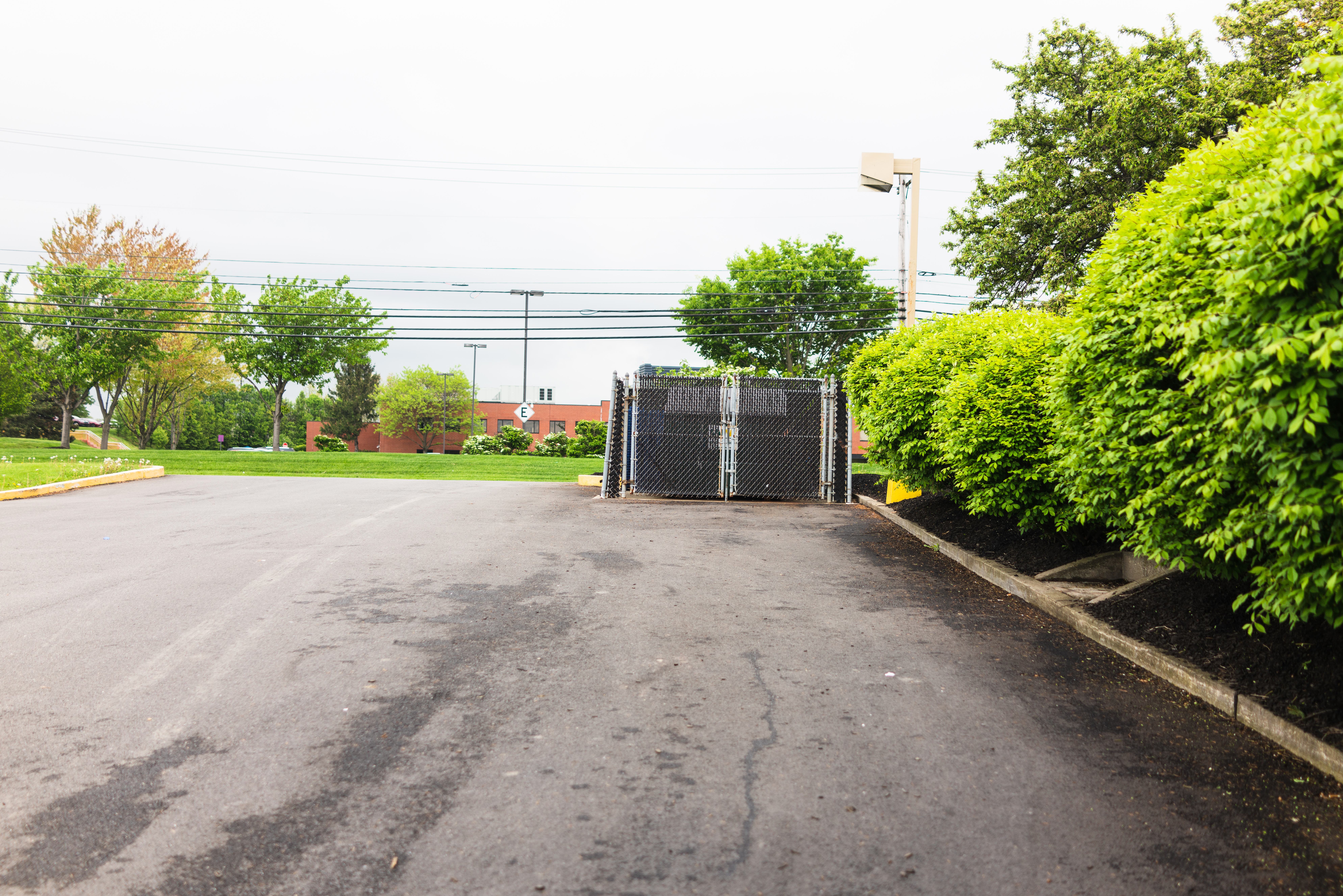 This photograph captures a quiet, seemingly forgotten area of a parking lot, characterized by a stark chain-link gate that blocks access ahead. Lush greenery frames the edges, offering a contrast between natural beauty and urban neglect, while the overcast sky adds a subdued, contemplative mood. The composition, with its empty pavement leading the eye toward the gate, evokes a sense of stillness and introspection.