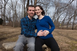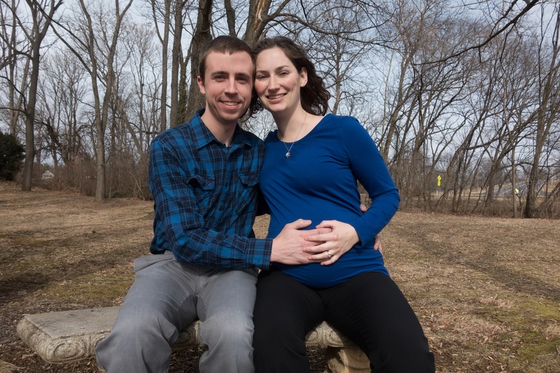 In this intimate outdoor portrait, a couple sits closely together on a weathered stone bench, framed by bare trees in a soft, overcast setting. Their warm smiles radiate joy and anticipation, reflecting the tender connection as they celebrate an upcoming addition to their family. The cool tones of their clothing contrast beautifully with the muted earth tones, creating a serene and hopeful atmosphere.