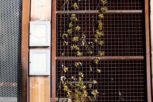 This photograph portrays an industrial wall accented by delicate greenery, where vibrant vines intertwine through a rusted metal grid. The juxtaposition of the hard textures against soft foliage conveys a serene, yet gritty atmosphere, captured under bright, natural light that enhances the scene's contrast. The two blank frames add an intriguing element, inviting contemplation about their unfilled potential.