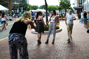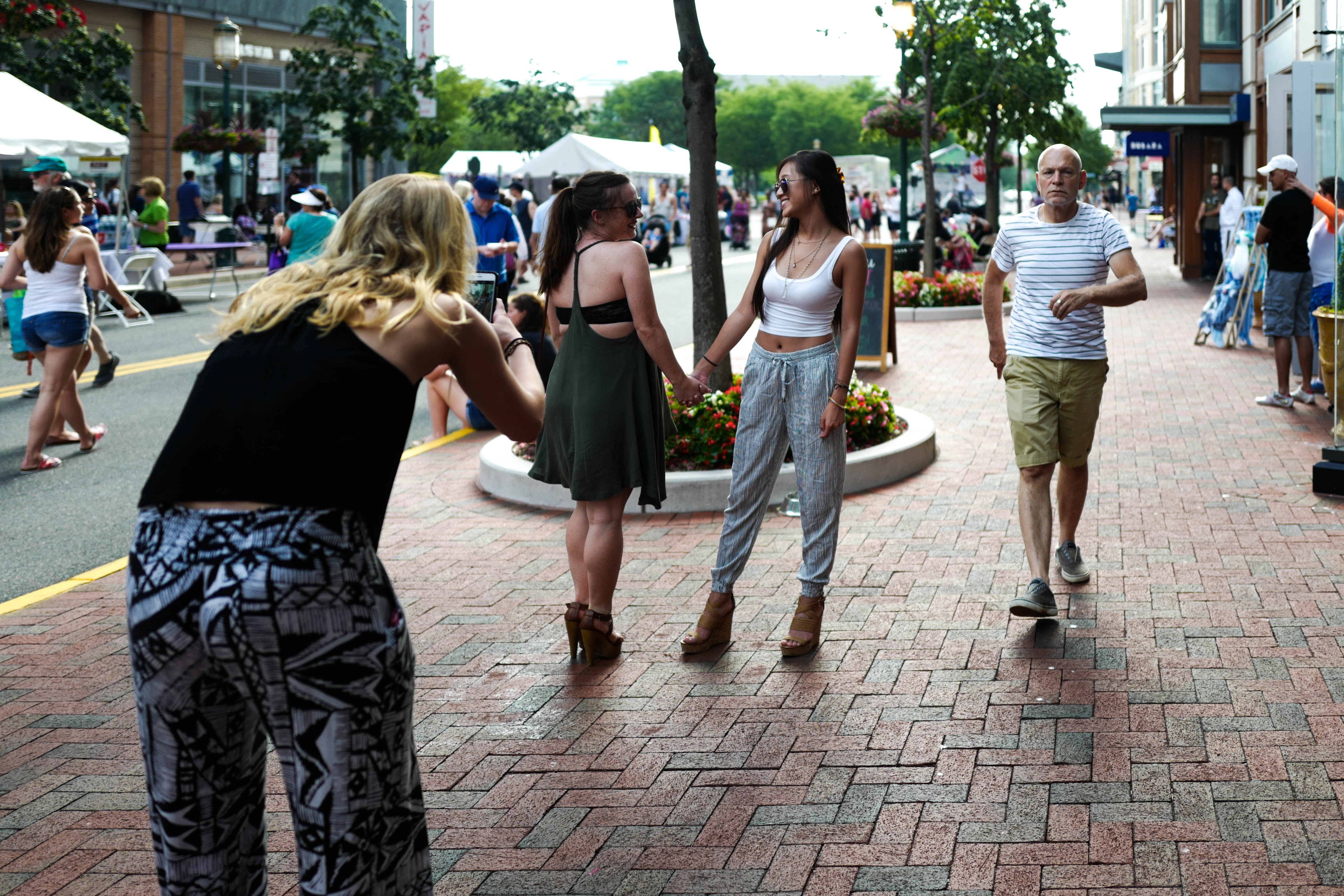 In a lively outdoor market scene, two young women share a playful moment, holding hands and smiling at each other while posing for a photograph. The composition captures the vibrant atmosphere of the street, with colorful stalls and casual passersby, all bathed in soft, natural light that enhances the cheerful mood of the day.