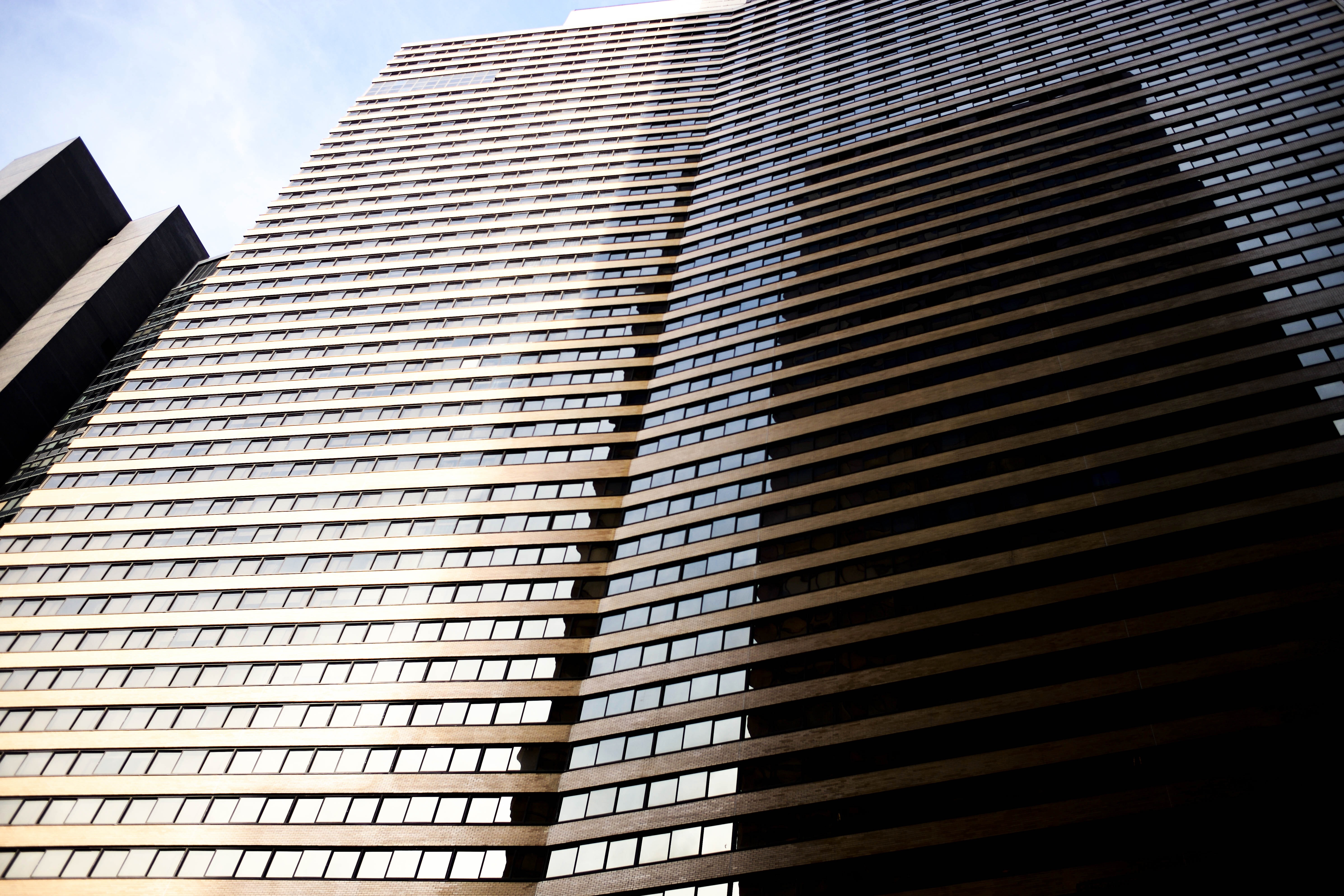 The photograph captures a towering skyscraper from a low angle, emphasizing its imposing vertical lines and grid-like facade. The interplay of light on the glass windows creates a dynamic mood, highlighting reflections that offer glimpses of the sky alongside the building's angular forms. The composition evokes a sense of ascent, drawing the viewer's eye upward through the maze of architectural lines.
