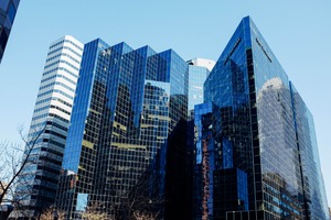 The photograph showcases a cluster of modern skyscrapers, their glass facades shimmering under a clear blue sky. The angular composition and varying heights create a dynamic visual rhythm, while reflections from neighboring buildings add depth and complexity. This urban scene evokes a sense of ambition and the hustle of city life amidst a serene atmosphere.