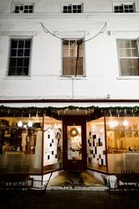 A quaint café glows invitingly against the night, its warm interior contrasting with the cool darkness outside. Light spills through the large windows, highlighting a playful arrangement of colorful squares that decorate the glass, while a festive wreath adds a touch of cheer. The empty chairs outside suggest a moment of pause, inviting passersby to step in and relax.