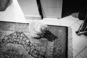 In this tranquil black-and-white scene, a soft, light-colored cat sits quietly on an intricately patterned rug, immersed in its thoughts. The gentle lighting casts a moody ambiance, accentuating the warmth of the surroundings while adding a sense of intimacy. The composition draws the viewer's eye to the cat's serene posture, creating a feeling of calm and reflection in an everyday setting.