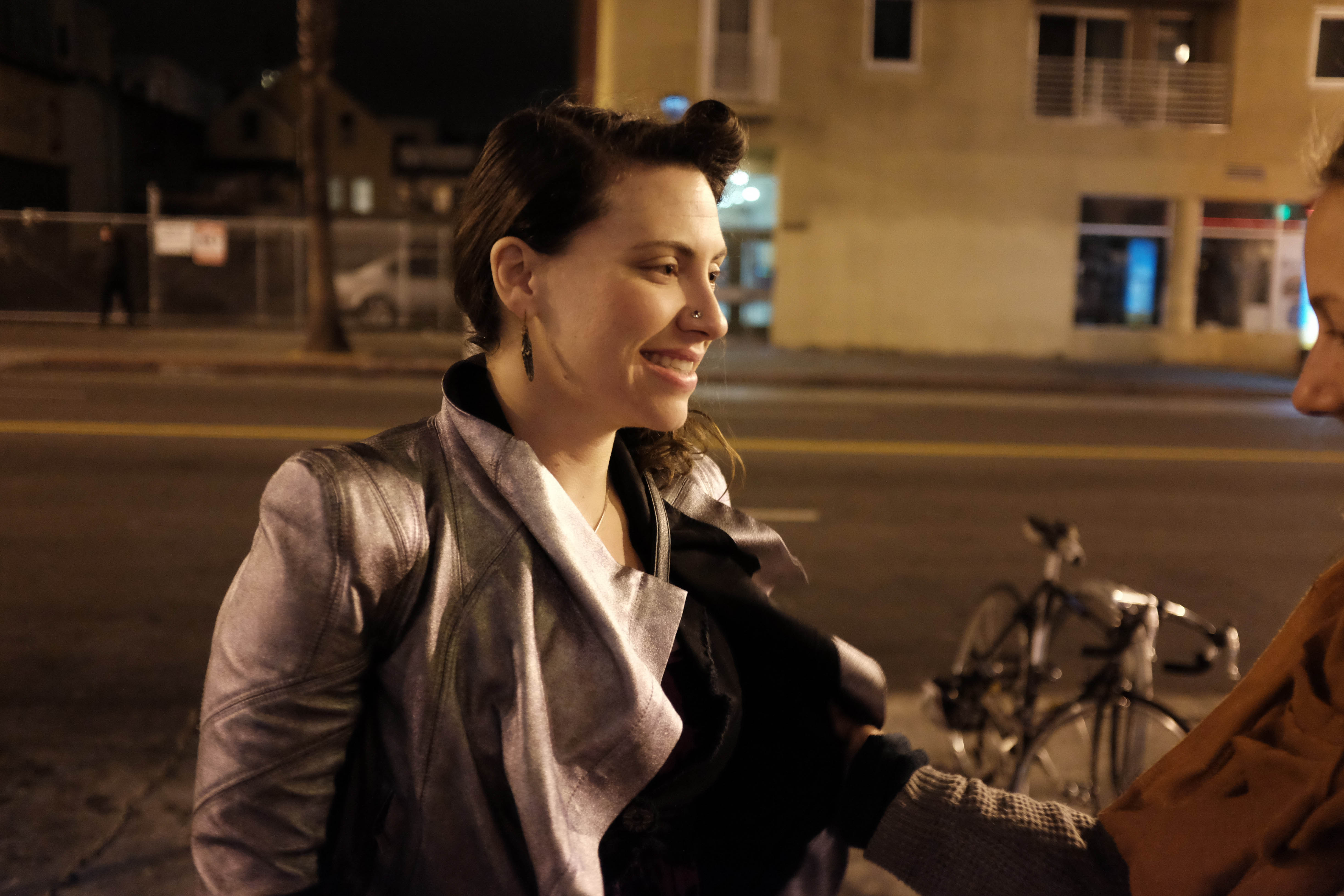 In this intimate street scene, a woman beams with warmth and joy, illuminated by soft streetlights. The composition captures her dynamic presence against a backdrop of muted urban tones, evoking a sense of connection and spontaneity on a lively night. The playful interplay of shadows enhances the candid, personal moment shared with her companion.