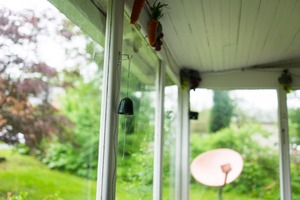 This photograph captures a cozy corner of a sunroom, where a small green bell hangs delicately, hinting at moments of tranquility. Soft, natural light filters through the glass, illuminating the vibrant green garden outside and creating a serene atmosphere. The eclectic decor—a mix of vibrant faux vegetables and a distant pink satellite dish—adds a whimsical touch to the peaceful setting.