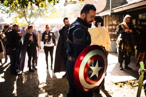 A man dressed as a superhero stands confidently, holding a vibrant shield decorated with stars and stripes. The warm, golden light filters through the trees, creating an inviting atmosphere, while fellow festival-goers engage in lively conversation in the background, adding to the sense of community and celebration.
