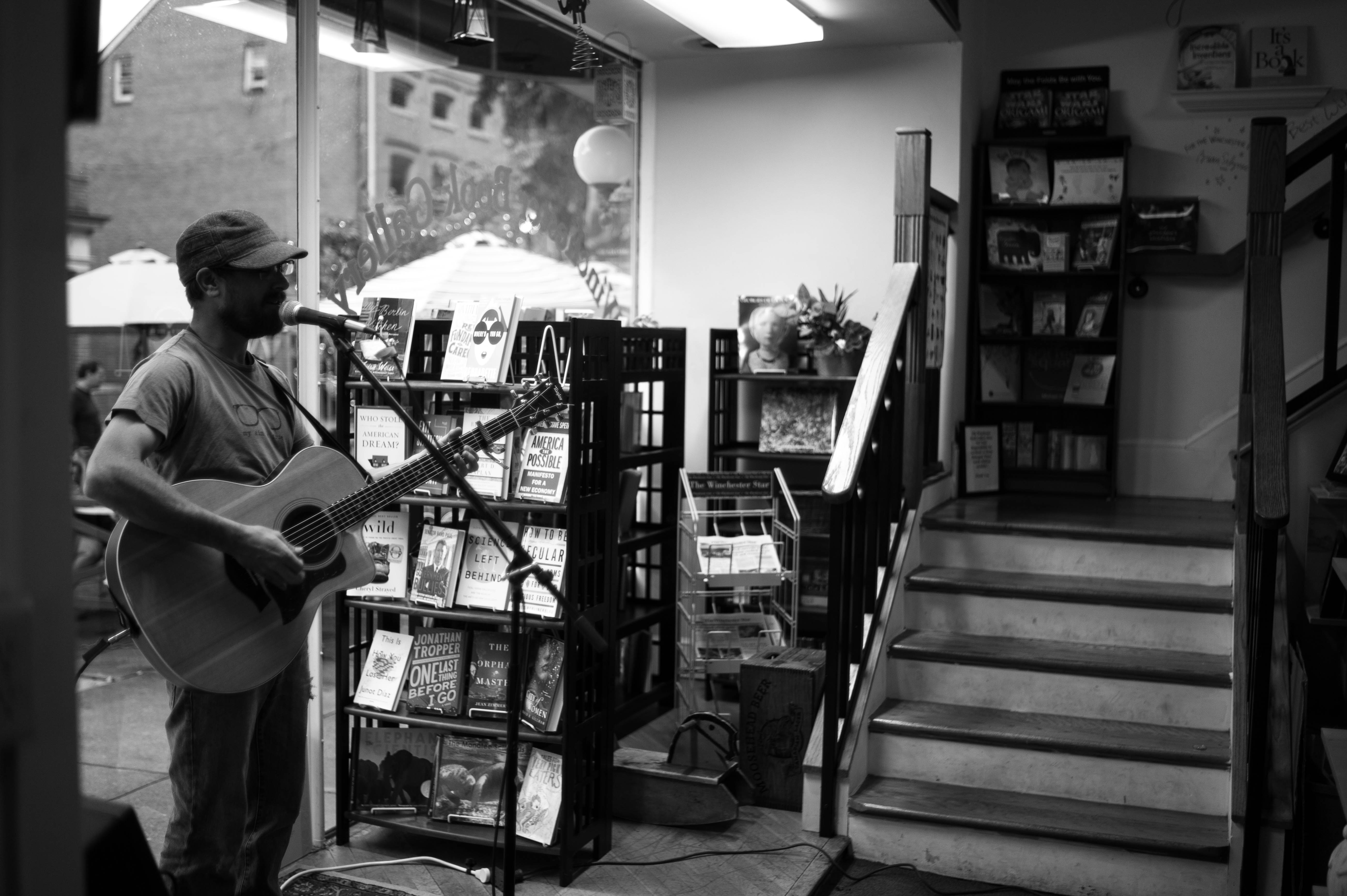 In a cozy bookstore, a musician strums his guitar while singing softly, captivating the intimate space. The black-and-white composition highlights the warmth of the scene, with shelves of books framing the artist and creating a rich texture. Soft natural light spills through the window, inviting a serene, reflective mood that envelops the room.