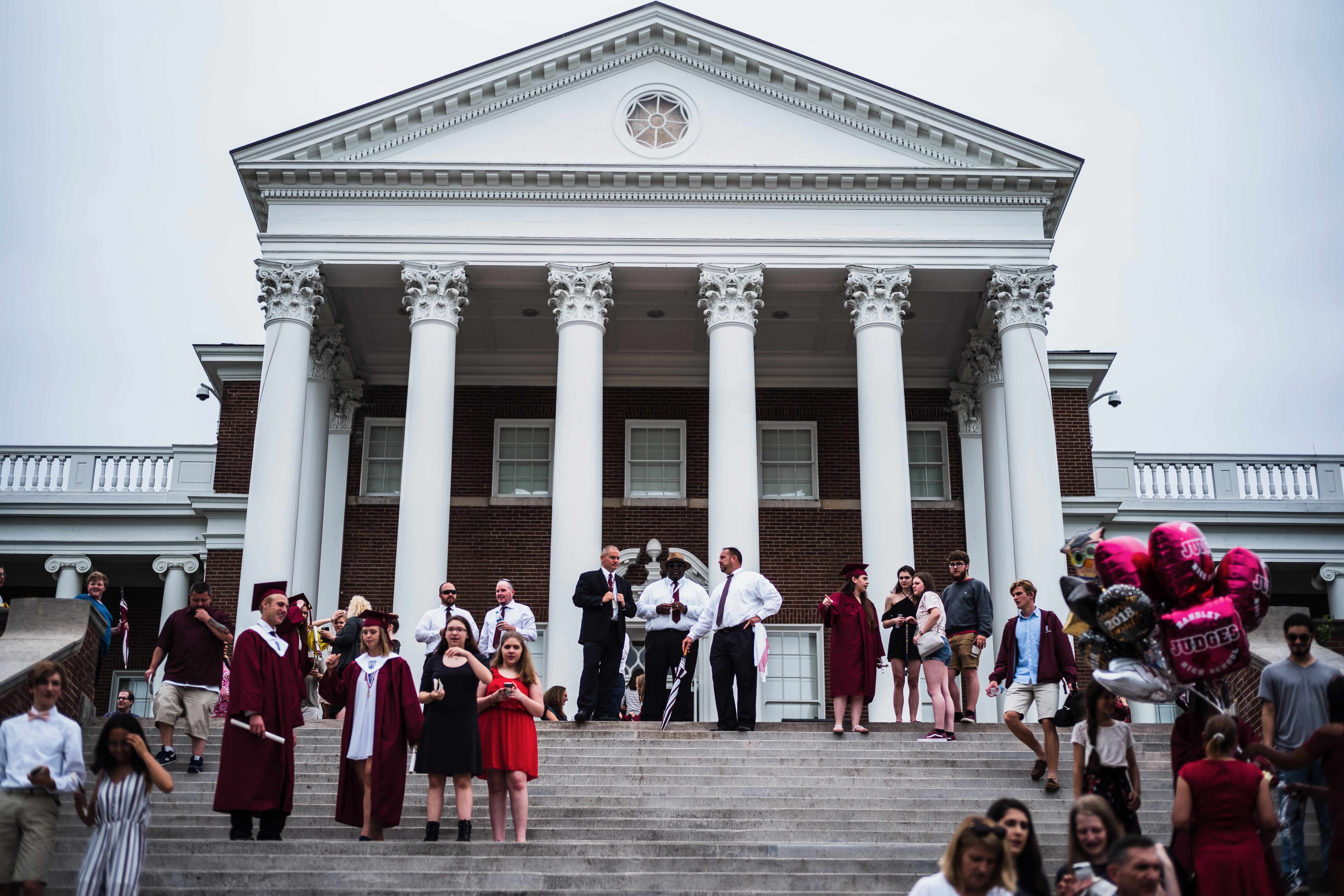 In this vibrant graduation scene, groups of graduates and their families gather on the grand steps of a historic building, capturing a moment of joy and celebration. The composition highlights the architectural grandeur, while the overcast sky casts a soft, diffused light, enhancing the festive mood. Balloons and red gowns add bursts of color, symbolizing achievement and new beginnings amidst a proud gathering.