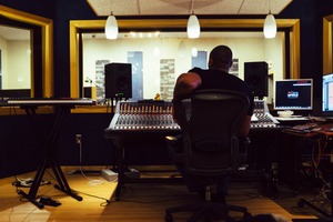 The photograph captures a sound engineer deeply immersed in his craft, seated before a sprawling mixing console in a dimly lit studio. The warm tones of the wood and pops of light create an inviting atmosphere, while the attentive posture of the subject conveys a sense of focus and creativity. Subtle shadows and the glow of computer screens enhance the mood, emphasizing the world of sound and artistry.