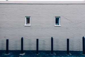 The photograph captures a stark, unadorned gray wall punctuated by two small windows that create a sense of symmetry. In the foreground, black posts rise against a muted backdrop, drawing the viewer’s eye in a linear fashion. The cool lighting imparts a tranquil yet slightly oppressive mood, evoking feelings of solitude in an urban setting.
