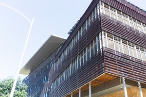 This photograph captures a contemporary building with a striking layered facade, blending sharp lines with a dynamic angle that draws the eye upward. Bright sunlight illuminates the rich textures of the wood and metal materials, enhancing the architectural details and creating a warm, inviting atmosphere. The clear blue sky serves as a vibrant backdrop, imparting a sense of openness and modernity to the scene.