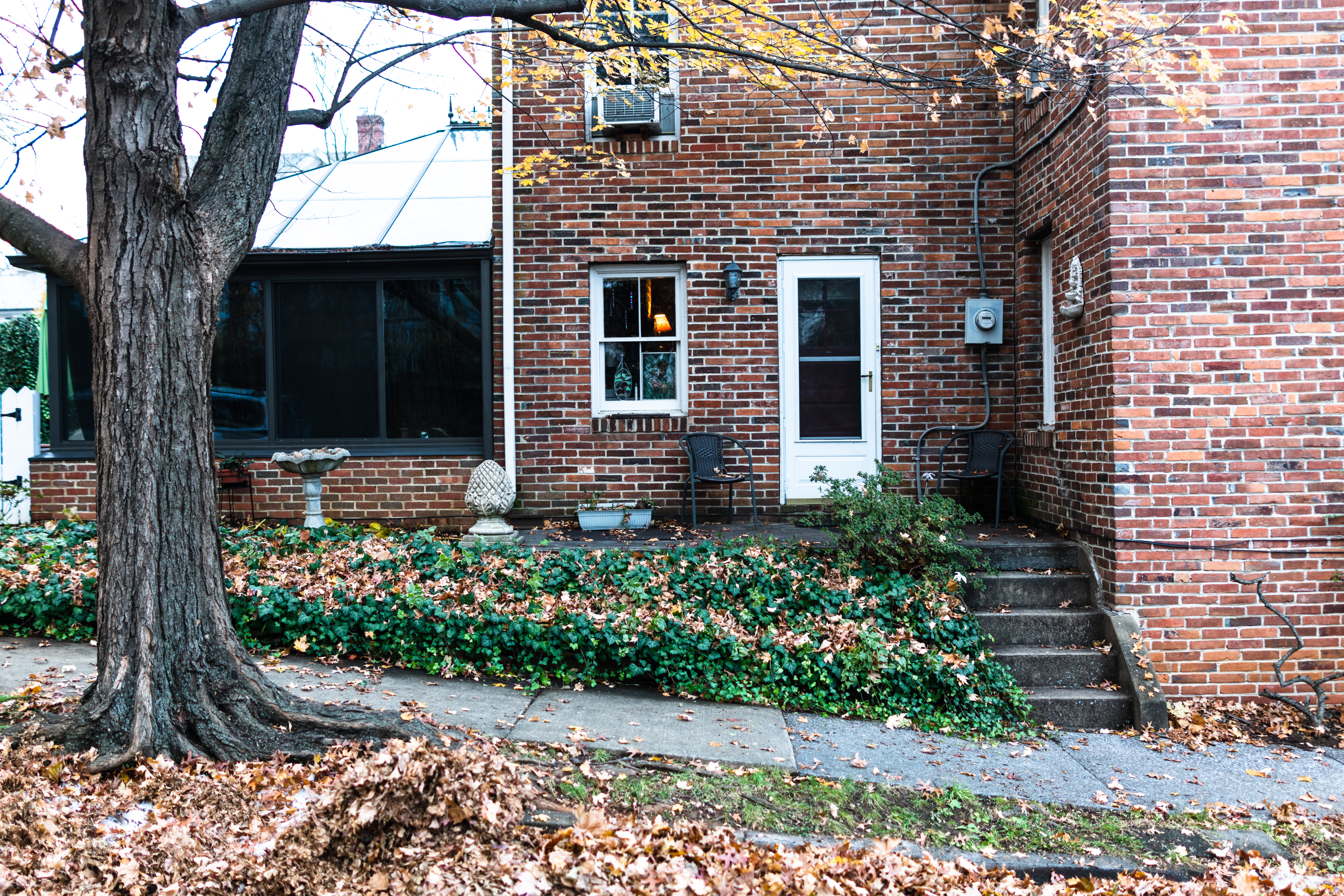 This photograph captures a cozy brick house nestled among autumn foliage, exuding a warm, inviting atmosphere. The rich textures of the brick are enhanced by the soft light illuminating the windows, hinting at the comforts within. The composition is balanced with the tree on the left framing the scene, while scattered leaves suggest a serene, transitional season.