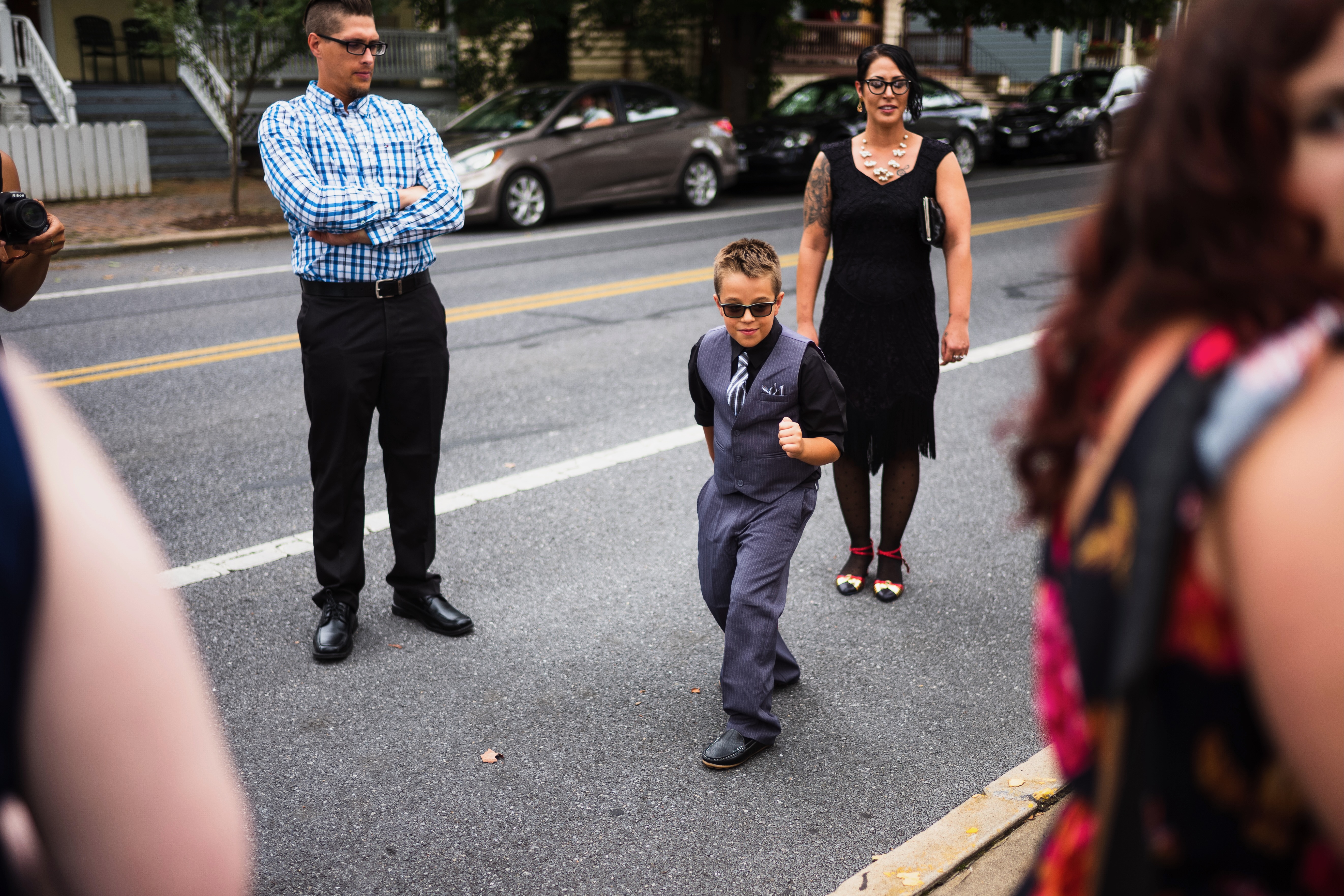 The photograph captures a young boy striding confidently down the street, dressed in a stylish suit and sunglasses, exuding a charming sense of swagger. Surrounding him are onlookers, including two adults who observe with amusement and pride, creating a warm, candid moment. The light filters softly through the trees, casting a gentle glow that enhances the playful atmosphere of the scene.