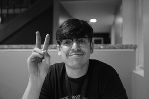 In this black-and-white photograph, a young man flashes a playful peace sign while seated at a dining table. The soft lighting highlights his relaxed expression, creating an inviting and cheerful mood against a blurred background that emphasizes intimacy and connection.