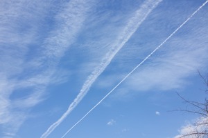 A serene expanse of blue sky is marked by the delicate trails of aircraft, leaving ethereal streaks against the soft, wispy clouds. The composition invites a sense of calm and contemplation, with the gentle interplay of light and shadow enhancing the peaceful atmosphere. The subtle details of the clouds and the expansive sky evoke a feeling of freedom and openness.