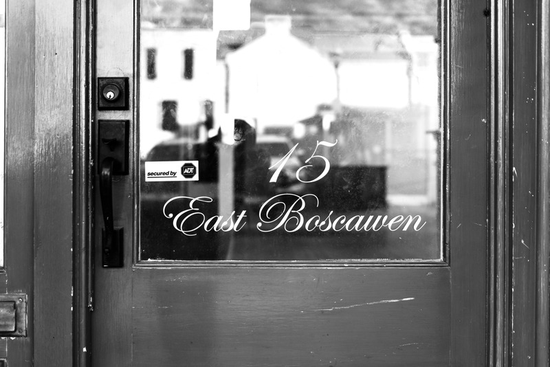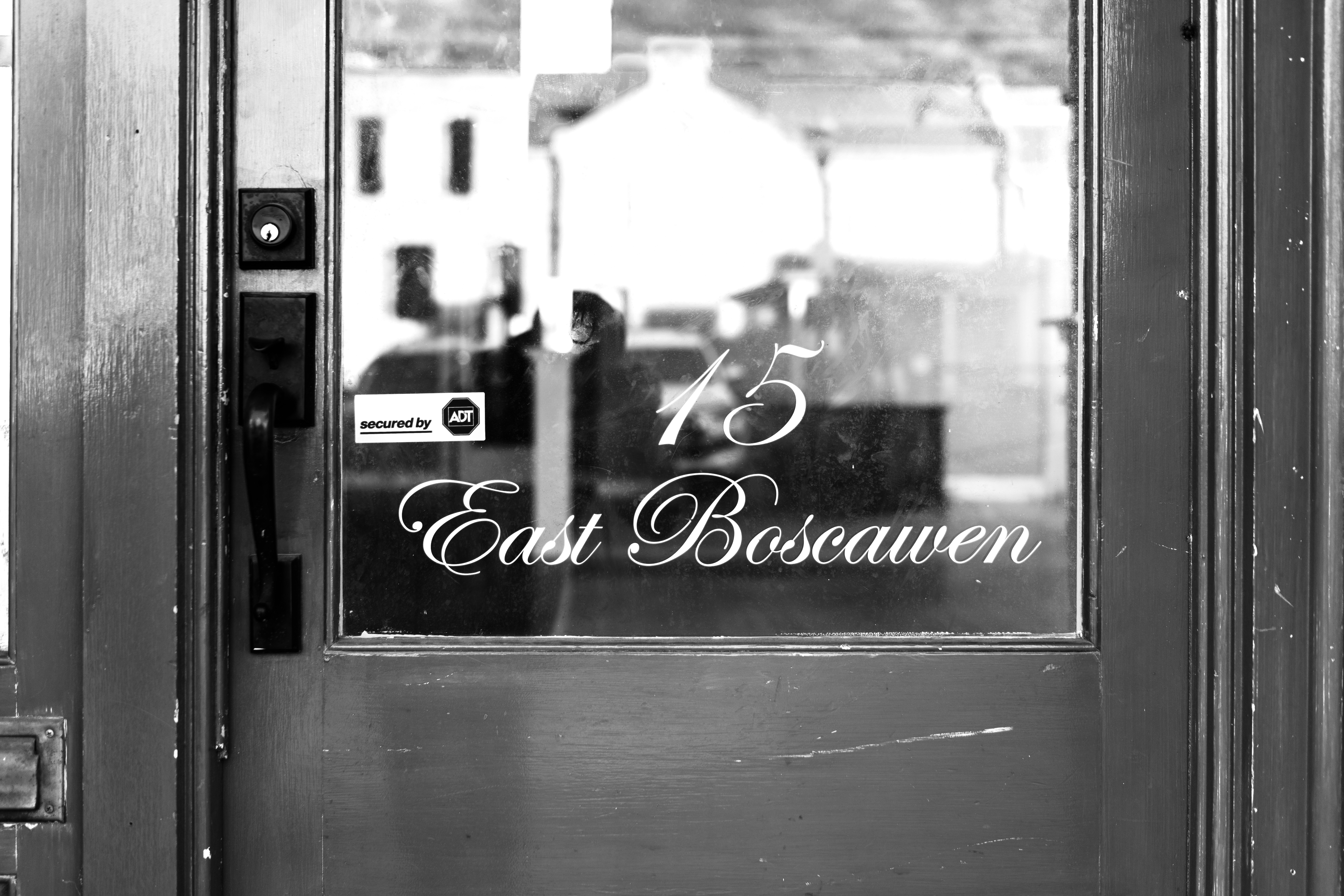 The photograph captures a close-up of an old wooden door featuring an elegantly scripted address, '15 East Boscawen.' The black and white composition adds a nostalgic mood, emphasizing the weathered details and reflections that hint at a quiet past. Soft, diffused light gently illuminates the glass, creating a serene yet contemplative atmosphere.