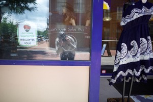 This photograph captures a storefront window reflecting a curious moment, where a chalk circle with numbers invites viewers to solve a puzzle. The light filters softly through the glass, adding a warm ambiance that contrasts with the cool blue of the dress displayed beside it. The playful interaction between the reflected figure and the vibrant colors evokes a sense of exploration and whimsy in a welcoming environment.