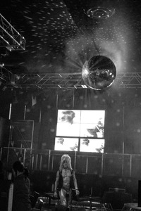 This monochromatic photograph captures a striking figure illuminated by a shimmering disco ball in a dim nightclub setting. The interplay of shadows and hazy light creates a surreal ambiance, suggesting a moment suspended between reality and fantasy. The composition, with a solitary subject against a backdrop of flickering screens, evokes a sense of introspection amidst the nightlife energy.
