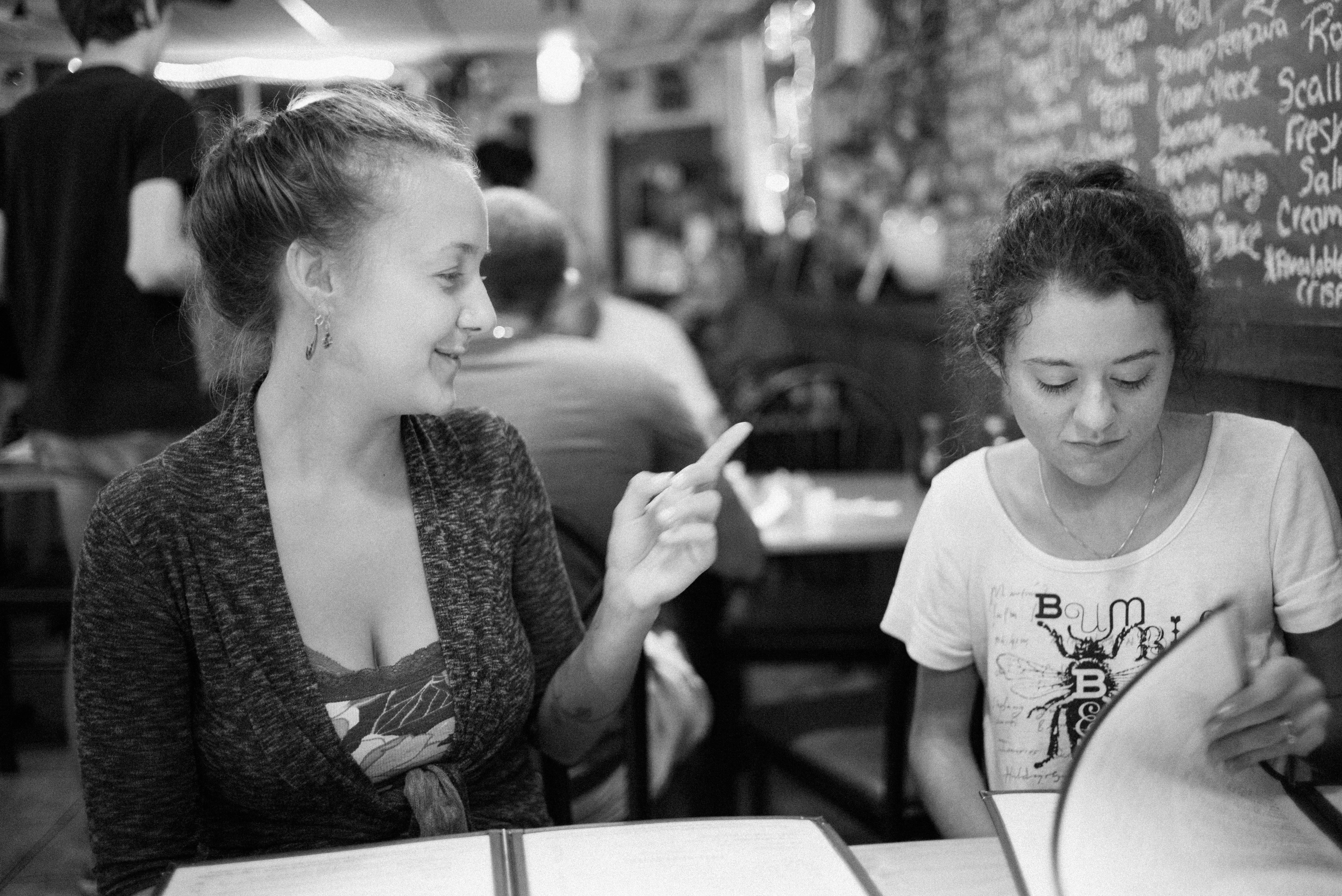 Two women share a light-hearted conversation over menus in a bustling café, exuding a warm and intimate atmosphere. The soft black-and-white tones highlight their expressions, with one animatedly gesturing while the other focuses on her menu. Background patrons and chalkboard displays create a cozy, lived-in vibe, enhancing the moment's authenticity.
