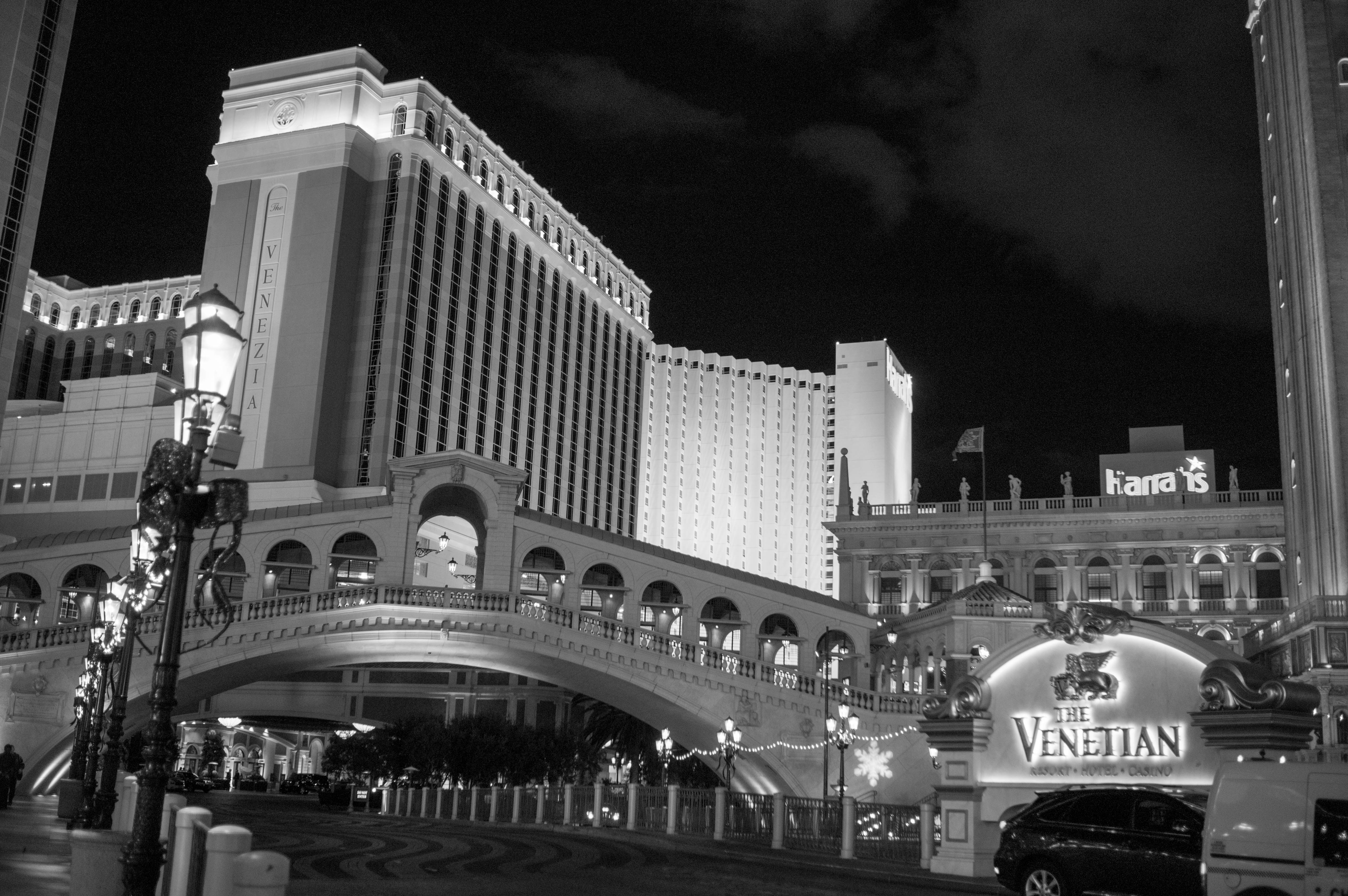 This striking black-and-white photograph captures the architectural grandeur of The Venetian in Las Vegas by night. The interplay of light and shadow creates a dramatic mood, emphasizing the elegant curves of the bridge and the towering buildings that loom overhead. The scene is bustling yet serene, evoking a sense of timelessness amidst the modern vibrance of the city.