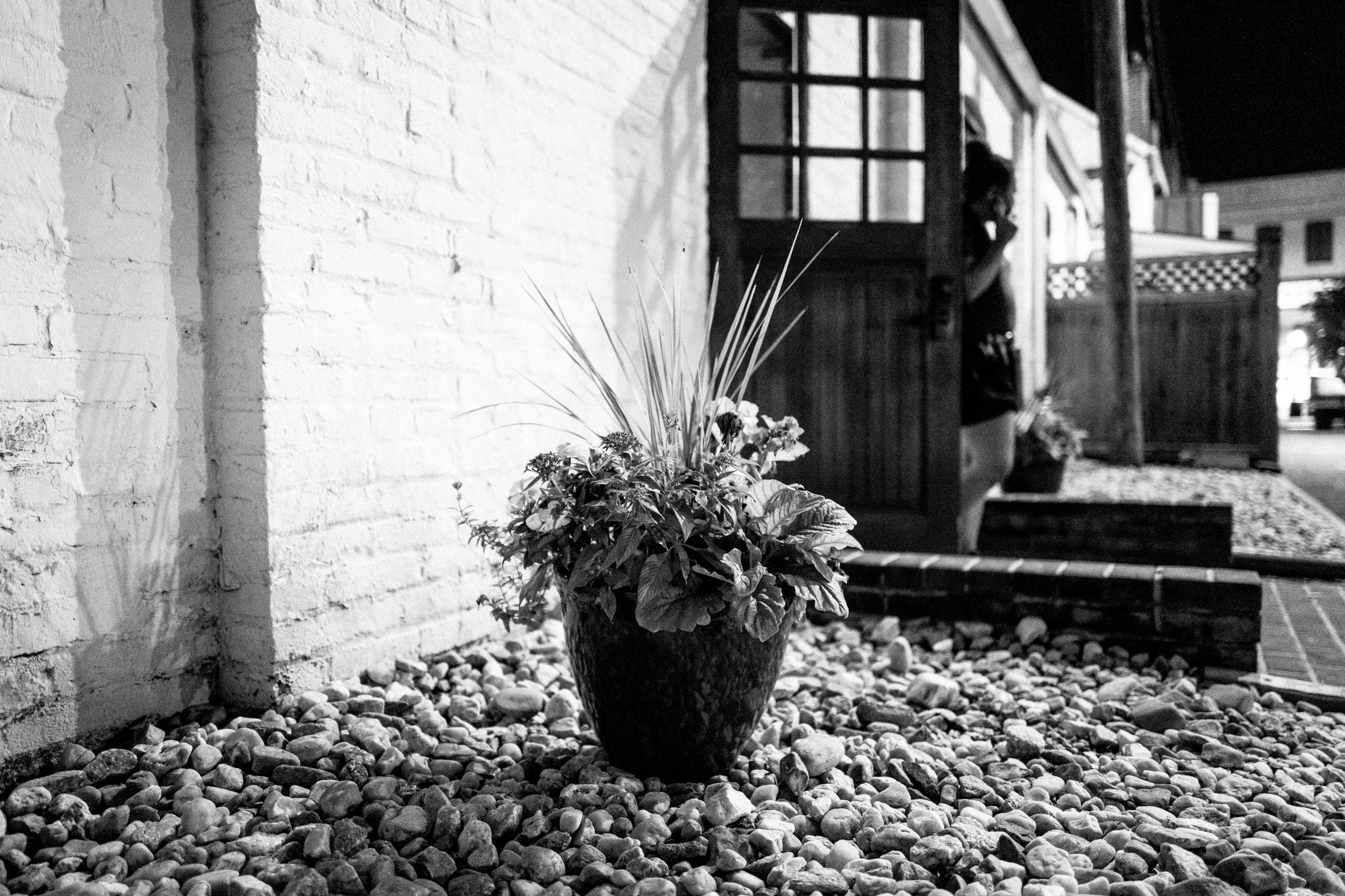 In a dimly lit urban corner, a potted plant stands prominently on a bed of pebbles, its foliage softly illuminated against the stark white wall. The background hints at a door, partially obscured by shadows, suggesting a sense of mystery. The overall mood evokes a feeling of quiet contemplation, with the monochrome palette amplifying the contrast between light and dark, highlighting the beauty of the ordinary.