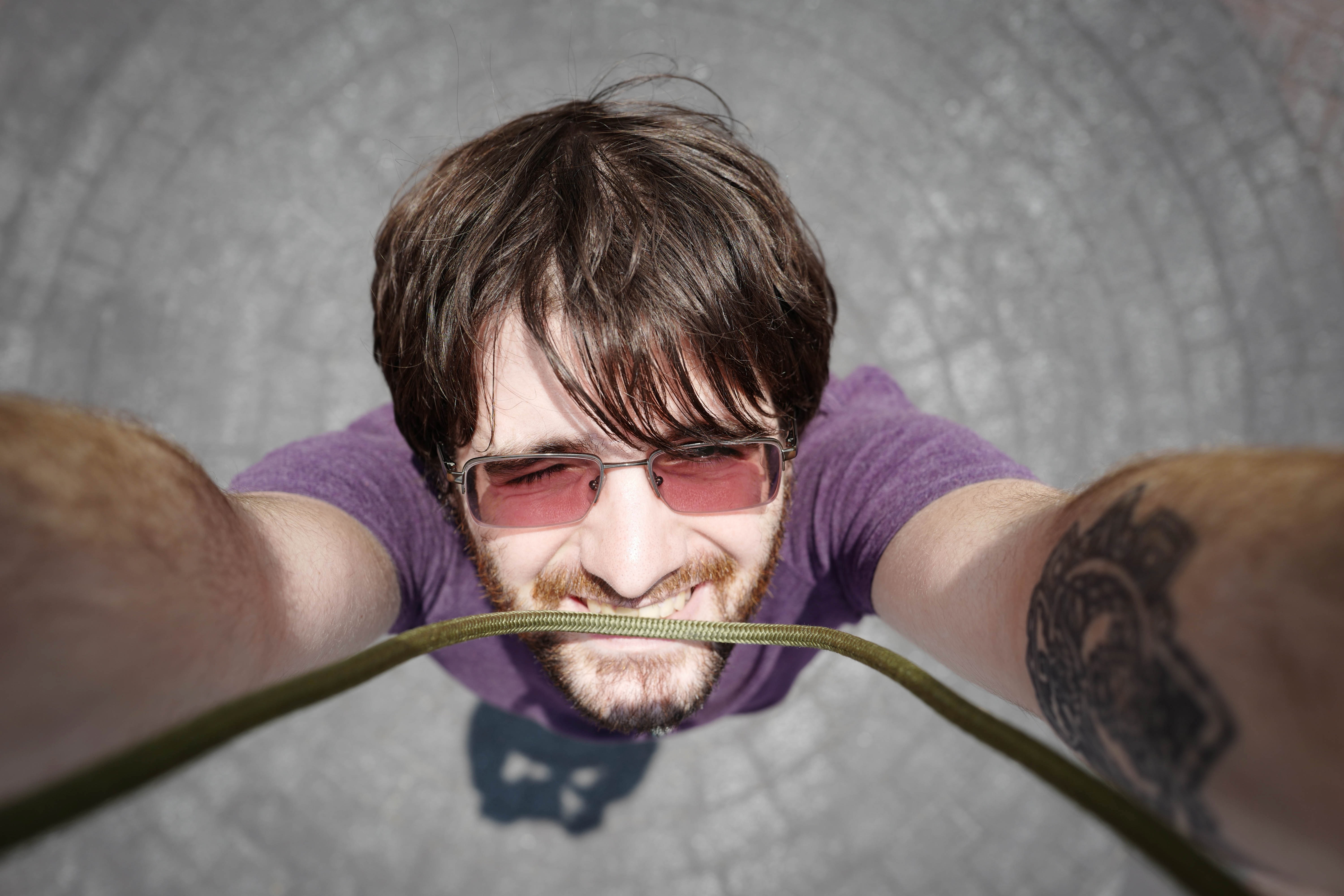 This close-up self-portrait captures a young man playfully biting a rope while extending his arms, creating a sense of dynamic engagement with the viewer. The overhead angle highlights the circular pattern of the ground, adding depth and context to the playful mood. Soft, bright lighting emphasizes the subject's friendly expression and the unique framing enhances a feeling of spontaneity and fun.