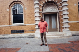 In this photograph, a casually dressed man stands on a textured pavement, absorbed in his phone against a backdrop of ornate brick architecture. The warm tones of the building contrast with the man's bright shirt, creating a relaxed yet contemplative mood. Soft, natural lighting enhances the scene, emphasizing both the subject and the inviting architectural details behind him.