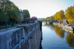This photograph captures a serene morning along the Seine River, where soft golden light filters through the trees lining the banks. The still water reflects the vibrant greenery and hints of blooming flowers, creating a tranquil atmosphere. The composition draws the eye along the river's gentle curve, inviting viewers to explore the peaceful landscape nestled within a bustling city.