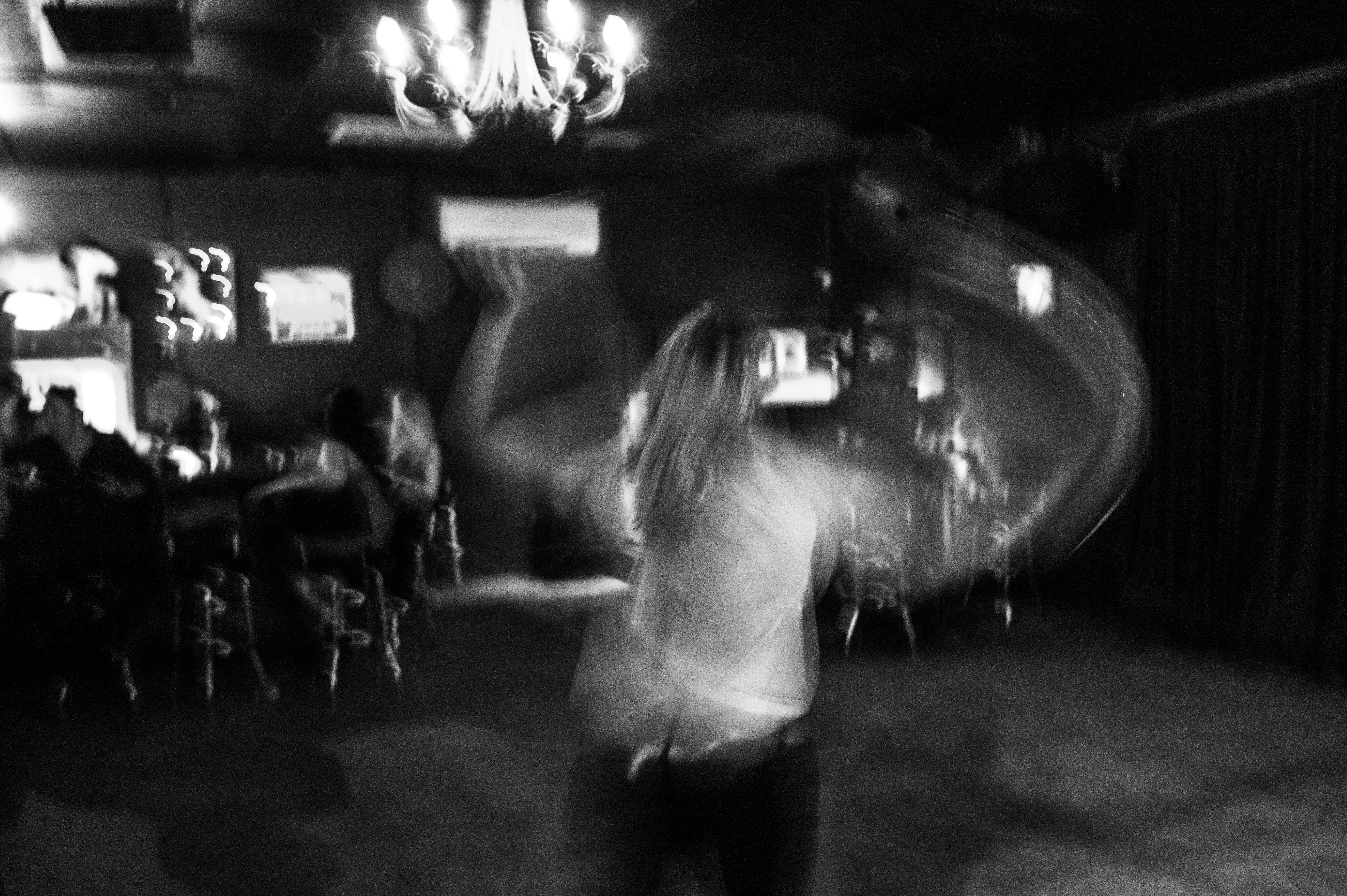 In a dimly lit space, a dancer spins with abandon, her motion captured in a blur that evokes a sense of freedom. The black-and-white tones enhance the mysterious atmosphere, while the soft glow of a chandelier above contrasts the darkness below. The composition draws the viewer into the moment, emphasizing both the joy of movement and the solitude of the dancer amidst a backdrop of quiet observers.