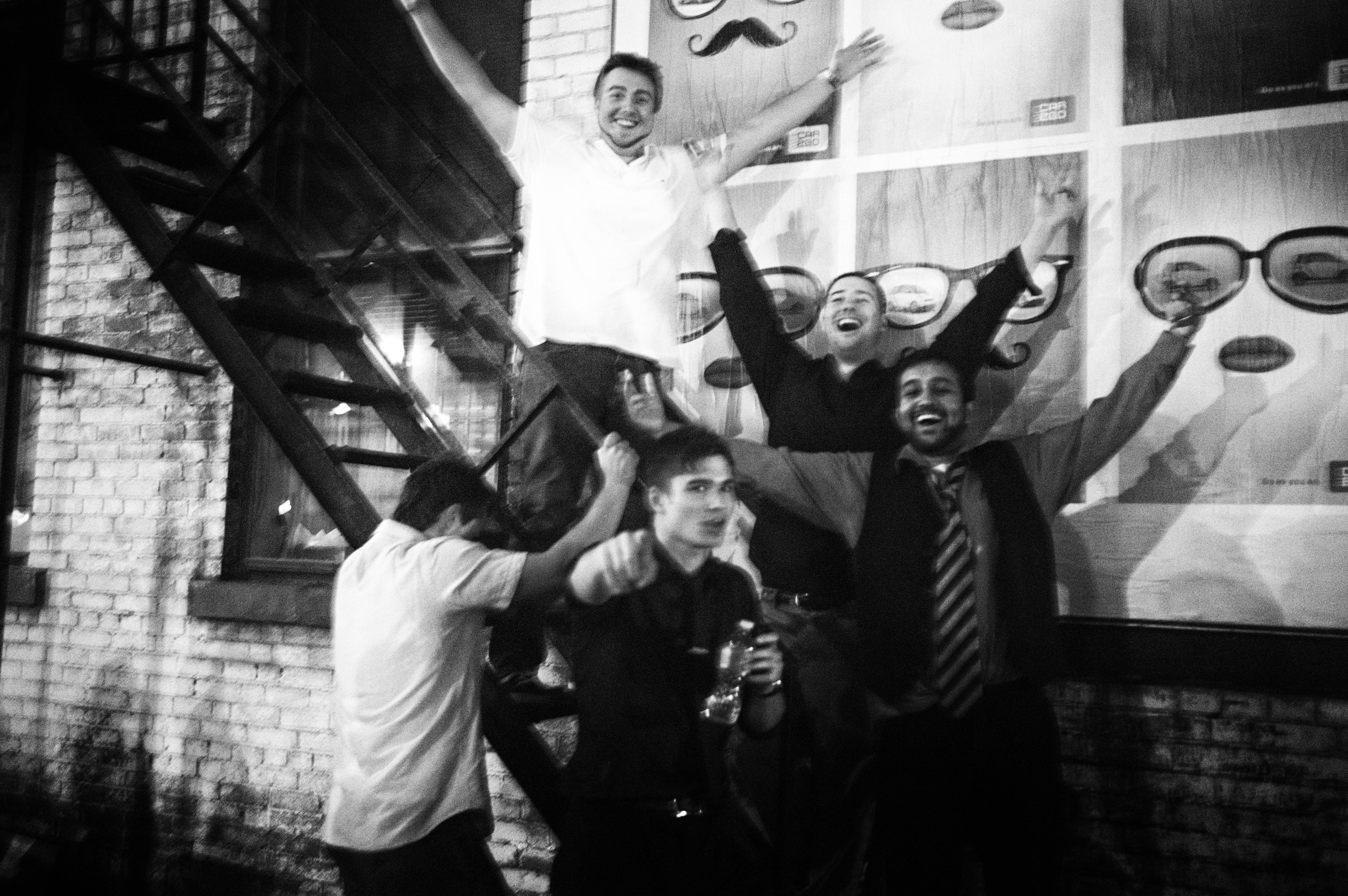 A lively group of friends joyfully poses on a staircase, embodying exuberance and camaraderie. The black-and-white composition enhances the playful mood, while the dramatic lighting casts striking shadows that accentuate their animated expressions. The backdrop of a whimsical mural adds a layer of charm to the festive atmosphere, inviting viewers into this moment of celebration.