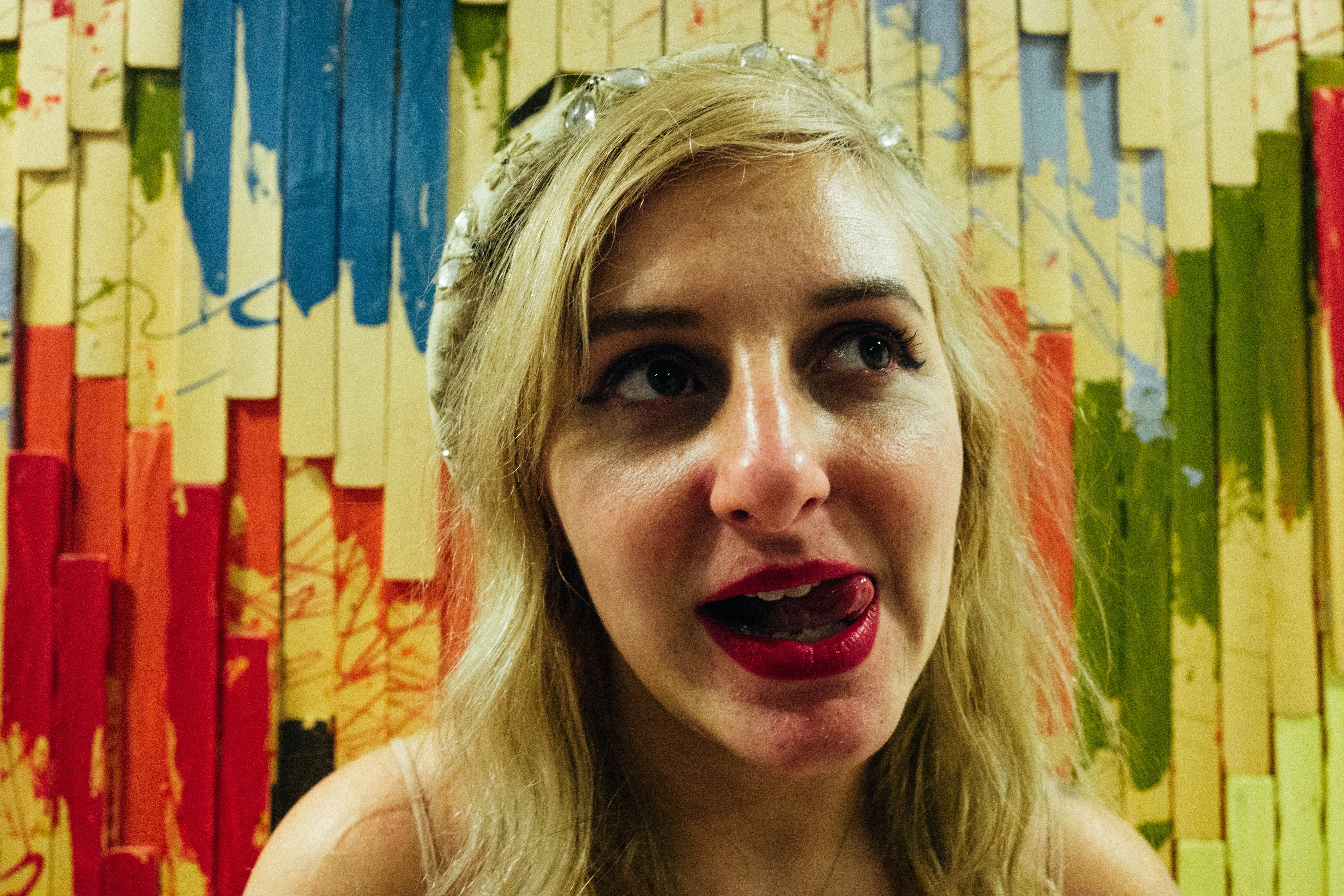 This close-up portrait captures a young woman's playful yet provocative expression, highlighted by bold red lipstick. The backdrop of colorful wooden panels enhances the mood, adding a vibrant chaos to the composition. The lighting casts an intimate glow, emphasizing her features and creating a sense of spontaneity.