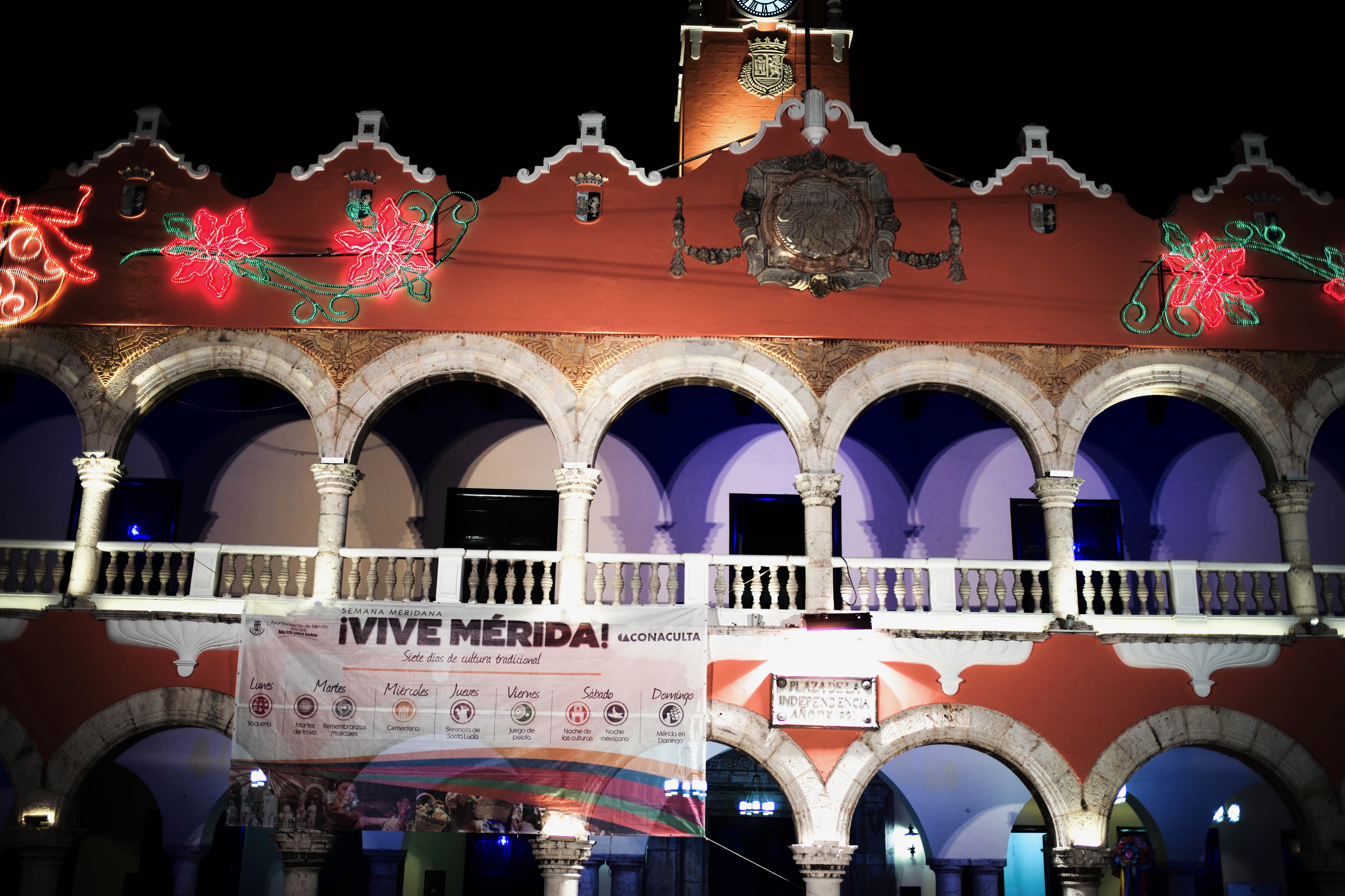 The photograph captures a beautifully illuminated colonial building at night, adorned with festive lights that reflect a vibrant cultural atmosphere. Arched columns frame the composition, drawing the eye upward towards the intricate details of the facade and clock tower above, creating a sense of historic grandeur. The warm hues of the building contrast with the cooler tones in the shadows, evoking a lively yet serene evening ambiance.
