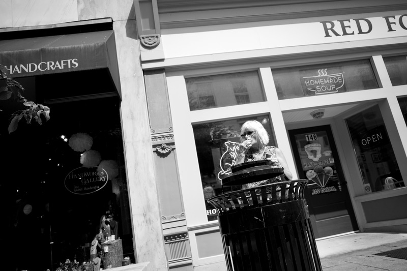 A woman with striking white hair stands pensively by a trash can, contrasting sharply against the bustling storefronts behind her. The composition leans towards an unconventional angle, enhancing the sense of isolation in an urban environment. The black and white palette heightens the mood, evoking a sense of nostalgia and quiet reflection amidst the vibrant city life.