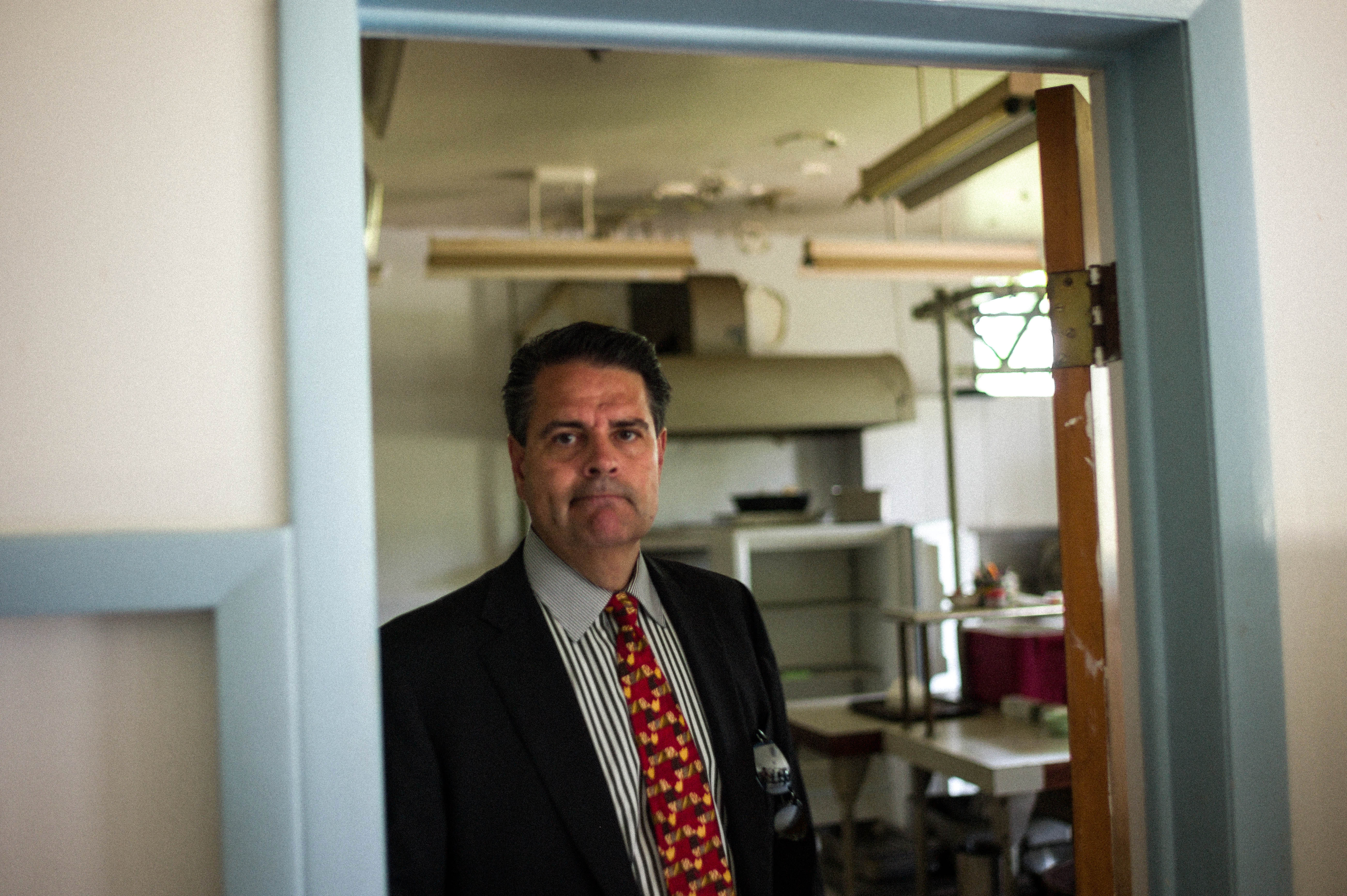 A man in a suit stands in a doorway, his expression revealing a mix of contemplation and concern. The dim lighting and slightly cluttered background create a sense of unease, while the soft blue frame of the door provides a contrasting calmness. The photograph captures a moment of introspection, inviting viewers to wonder about the story behind his demeanor.