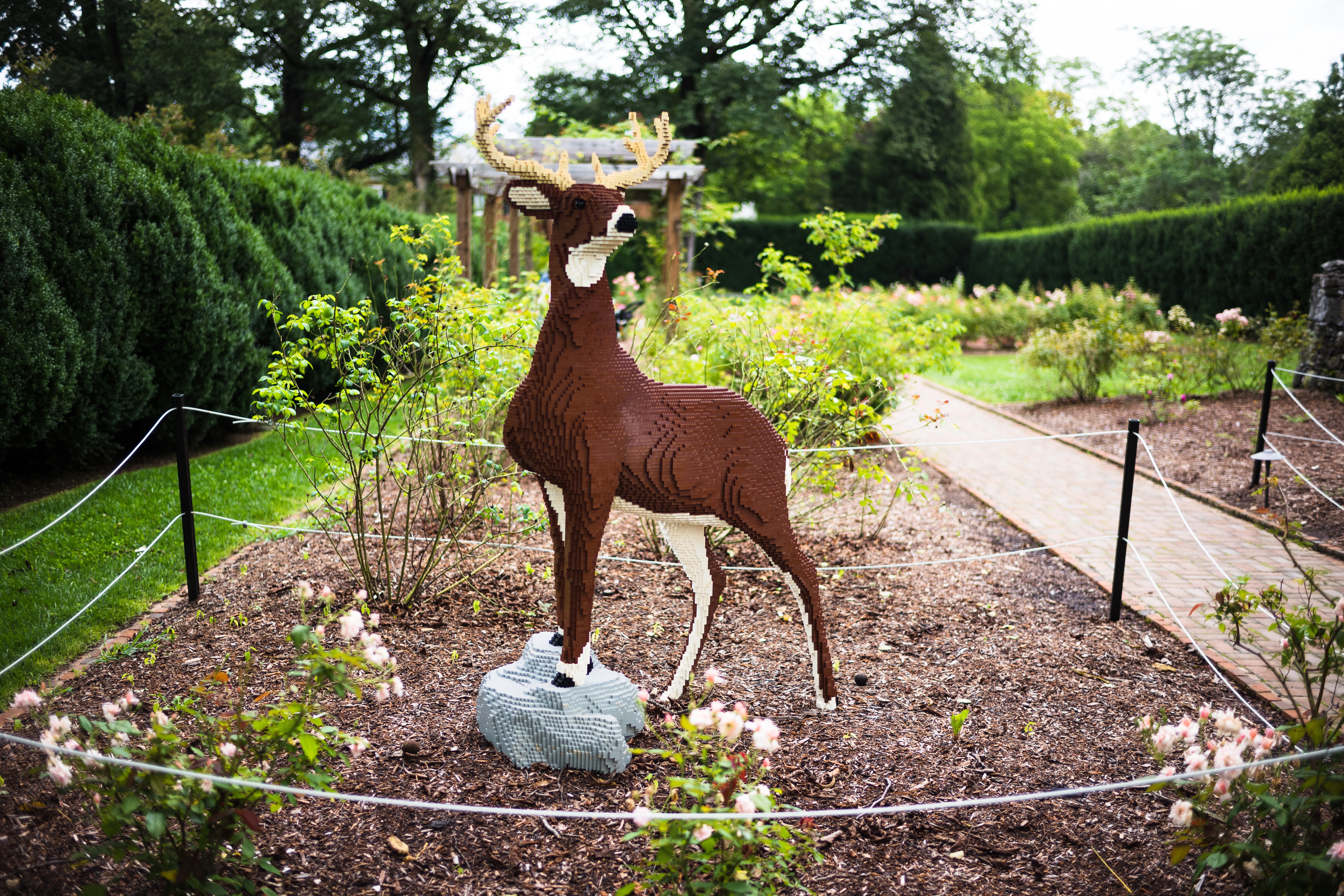 In a serene garden setting, a life-sized deer crafted from Lego bricks stands poised atop a stone, surrounded by lush greenery and blooming flowers. The soft, diffused light enhances the whimsical mood, highlighting the intricate details of the sculpture against the vibrant backdrop of nature. The composition invites a sense of playful curiosity, blending art and natural beauty harmoniously.
