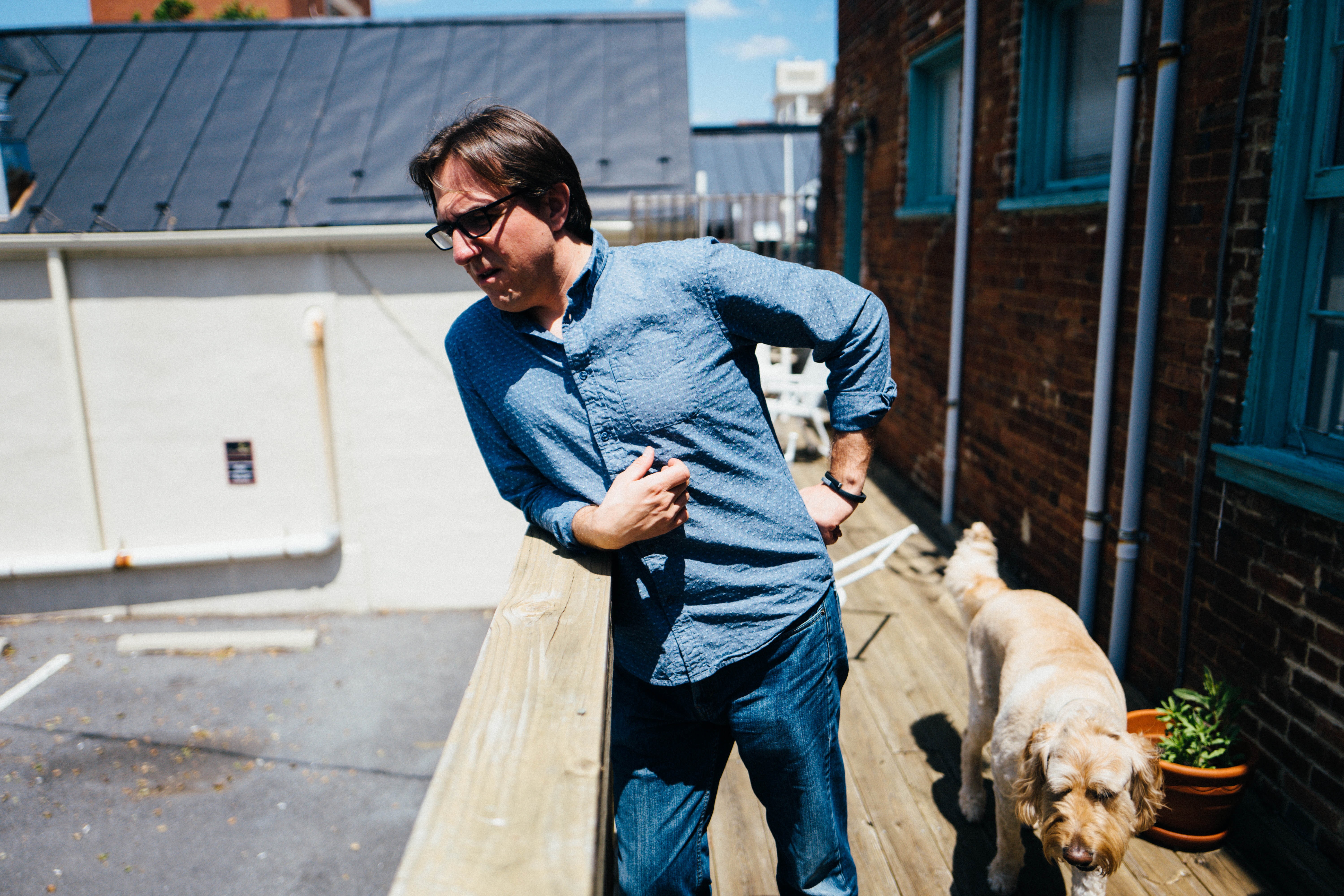 The photograph captures a relaxed moment on a wooden balcony as a man leans thoughtfully against the railing. Sunlight floods the scene, illuminating his denim shirt and creating soft shadows, while a golden retriever wanders nearby. The vibrant colors and casual setting evoke a sense of serenity and warmth.